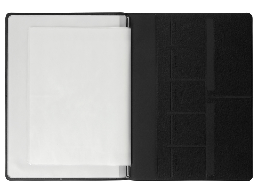 Обложка выполнена из экокожи, имеет внутренний слой из бархатистого материала и разбита на множество карманов: два больших кармана-отделения А4, 6 горизонтальных кармана с подписями и иконками, уточняющими тип документа, который можно поместить внутрь, пять карманов под визитки или кредитные карты.