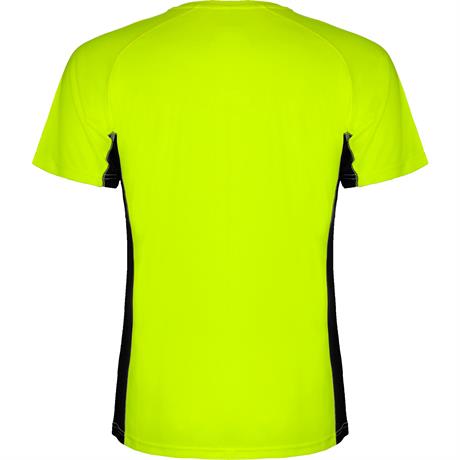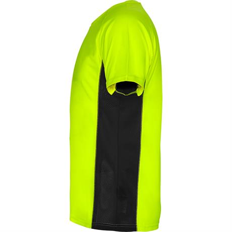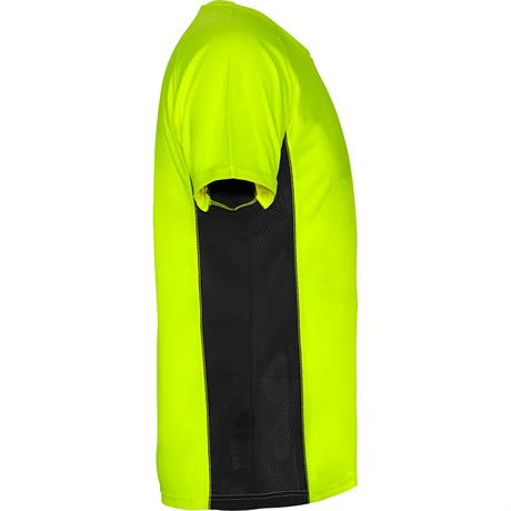 Спортивная футболка с короткими рукавами реглан, изготовленная из двух комбинированных тканей из полиэстера. Основная ткань — ткань bird's eye, а боковые вставки и рукав с внутренней стороны — с микроперфорированной ткани. Круглая горловина с усиленными- Цвет: Флуоресцентный зеленый/Черный