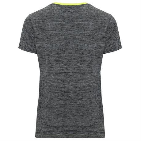 Женская Спортивная футболка с короткими рукавами. 1. Круглая горловина. 2. Сочетание двух тканей с полиэстера на спине, плечах и рукавах. 3. Основная ткань спереди — ткань bird's eye, и ткань space dye — сзади. 4. Спинка немного длиннее переда. Быстросохнущая дышащая ткань. *Съемная этикетка. *Техническая ткань. *Дышащая ткань. *Концепция Duo."- Цвет: Флуоресцентный желтый/Пёстрый черный