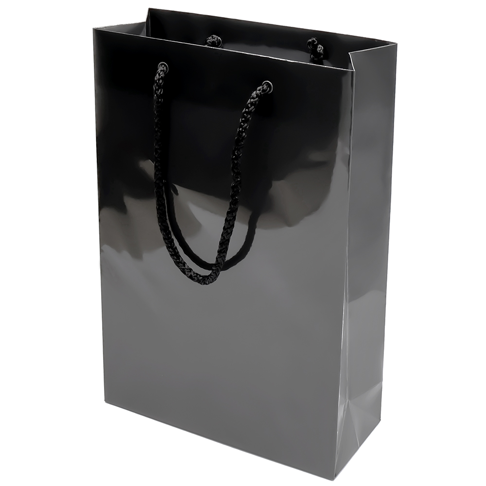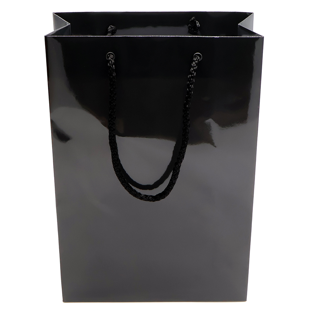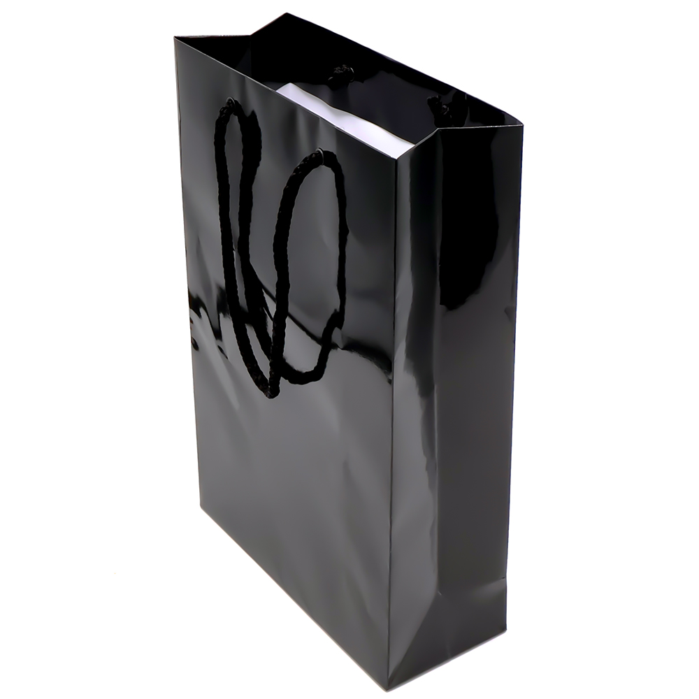 Бумажный пакет плотностью 170 г/м² с глянцевой ламинацией. Шнур 6 мм черного цвета. Люверс - черный.
