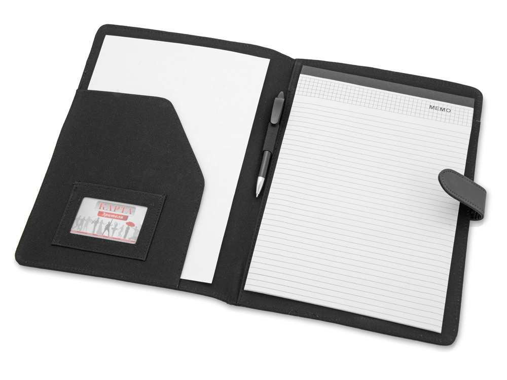 Стильная папка для документов с блокнотом и карманом под визитки - практичный бизнес-аксессуар, который обязательно пригодится. Папка закрывается на кнопку. На папку можно нанести символику организации при помощи тиснения. -