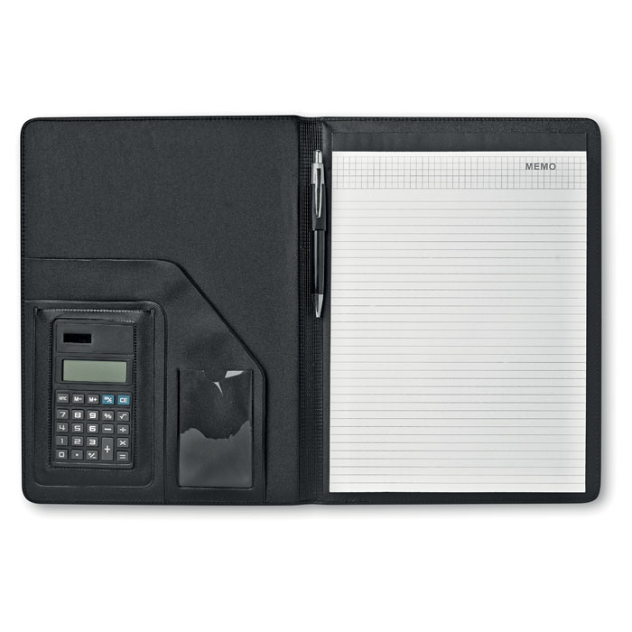 Папка А4 из искусственной кожи с калькулятором на солнечных батарейках, синей шариковой ручкой и блокнотом -