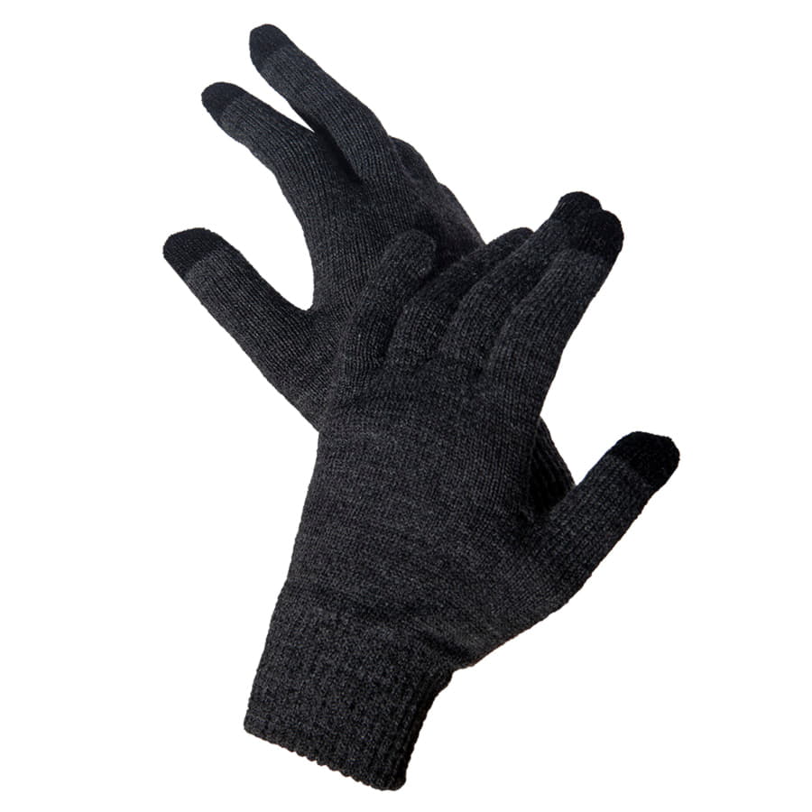 Перчатки из теплого и мягкого акрила с сенсорными наконечниками. Основной цвет: темно-серый меланж. Цвет сенсорных вставок: черный. Цвет, близкий к Pantone Cool Grey 11C. -