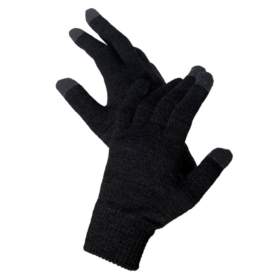 Перчатки из теплого и мягкого акрила с сенсорными наконечниками. Основной цвет: черный. Цвет сенсорных вставок: серый меланж. Цвет, близкий к Pantone 426C. -