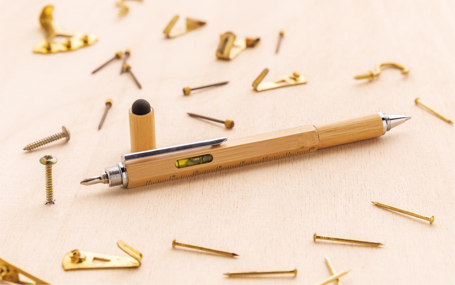 Многофункциональная ручка из натурального бамбука с линейкой (7 см), спиртовым уровнем, отверткой, стилусом и синими чернилами (способна прочертить линию до 400 м). Изготовлена из бамбука с алюминиевым клипом.