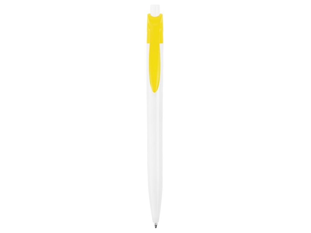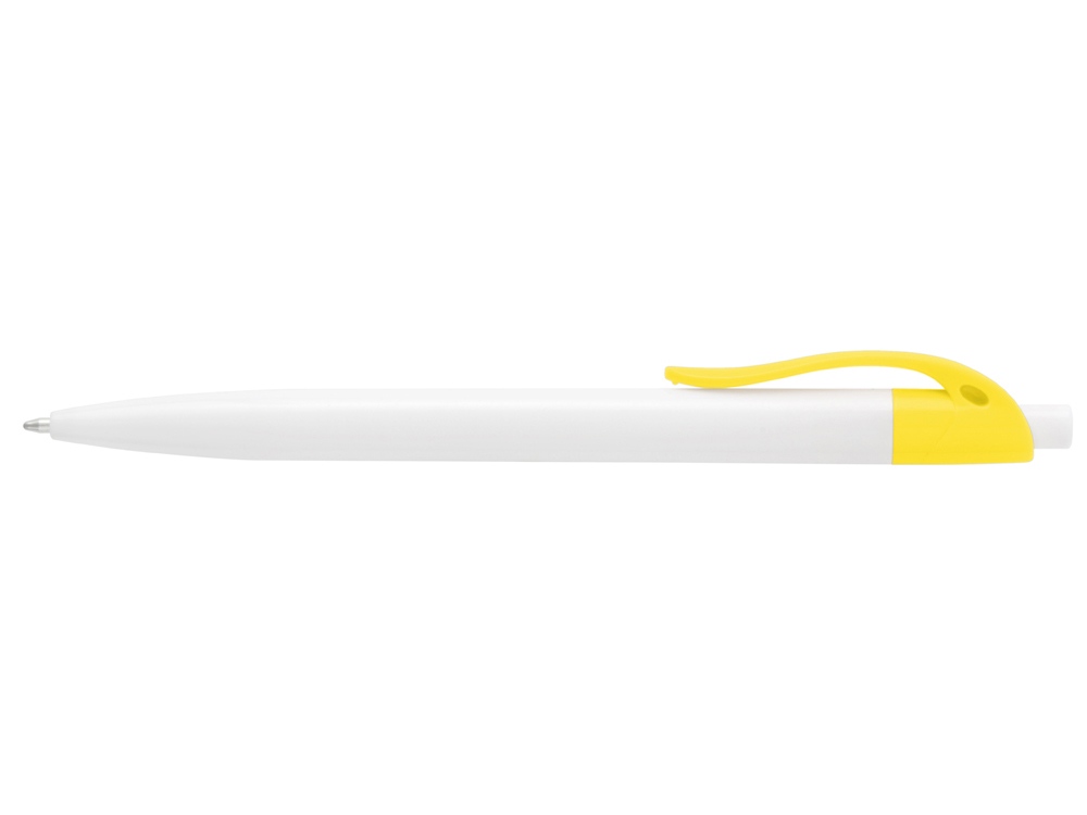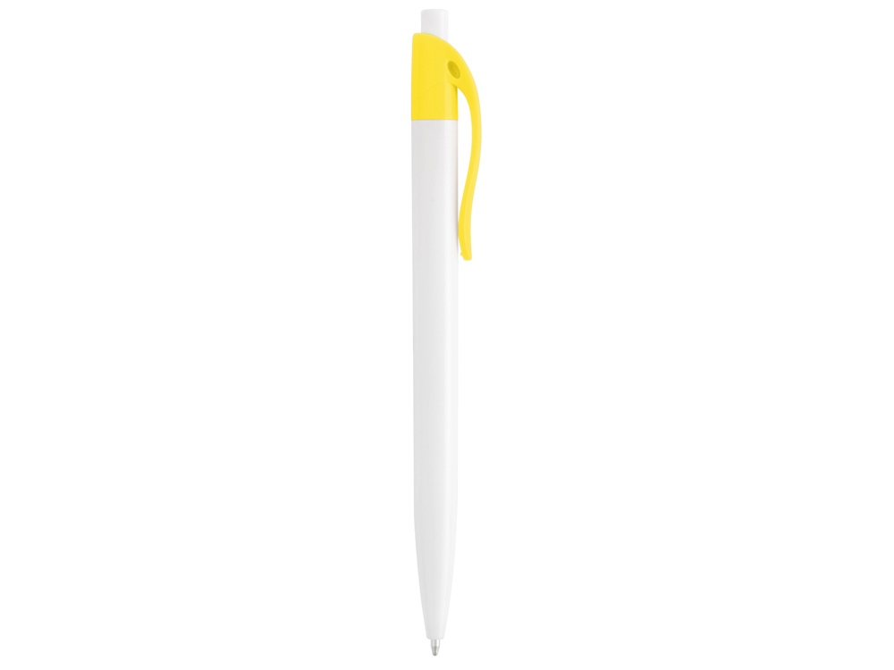Стильная пластиковая ручка с ярким цветным клипом и белым корпусом отлично подойдет для нанесения логотипов и рекламной информации. Нажимной механизм. -
