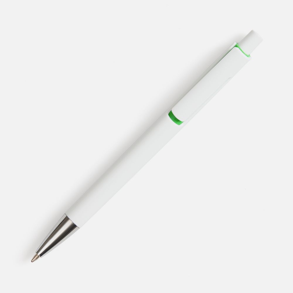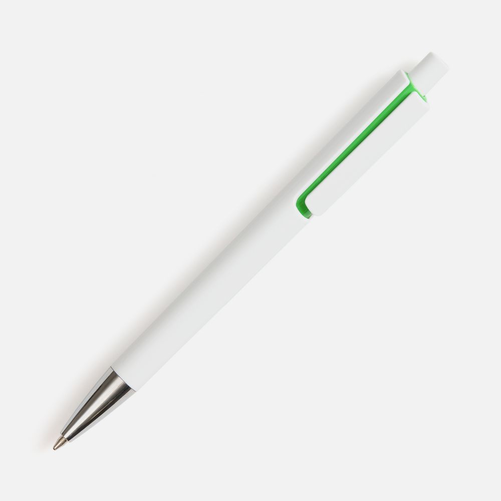 Шариковая ручка с глянцевым белым корпусом и цветовым акцентом у клипа, который дополнит логотип компании.- Механизм ручки: нажимной.