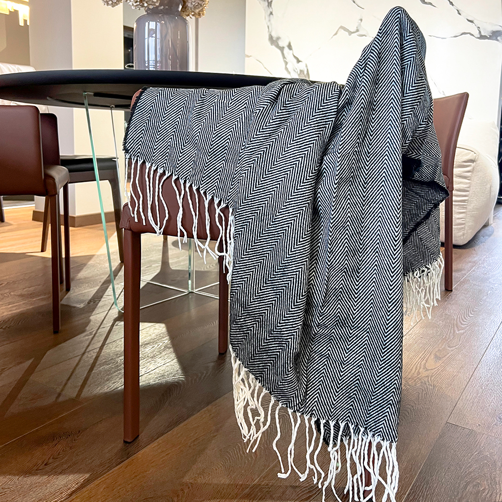 Плед SAMUM изготовлен из высококачественной акриловой пряжи, что позовляет добиться мягкости и тепла как от натуральной шерсти. Благодаря составу плед легкий, хорошо сохраняет теплоизолирующие свойства и надолго радует внешним видом. Также гипоаллергенен, не накапливает статическое электричество и легко стирается. Плед имеет классический узор “елочка”, с бахромой по краям. Для нанесения логотипа предусмотрена нашивка из кожзама (8 x 4 см). Плед упакован в пластиковый пакет, сложен в виде рулона с текстильным держателем.- Виды нанесений: Термотрансфер DTF, Гравировка-А3 (оптоволоконный лазер), Вышивка, Шелкотрансфер