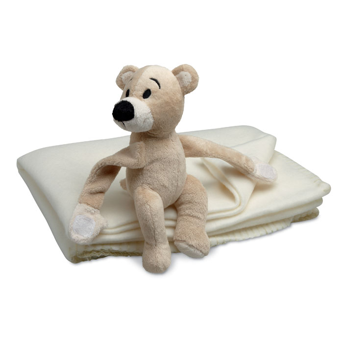 Флисовый детский плед с плюшевым мишкой, удерживающим одеяло. -