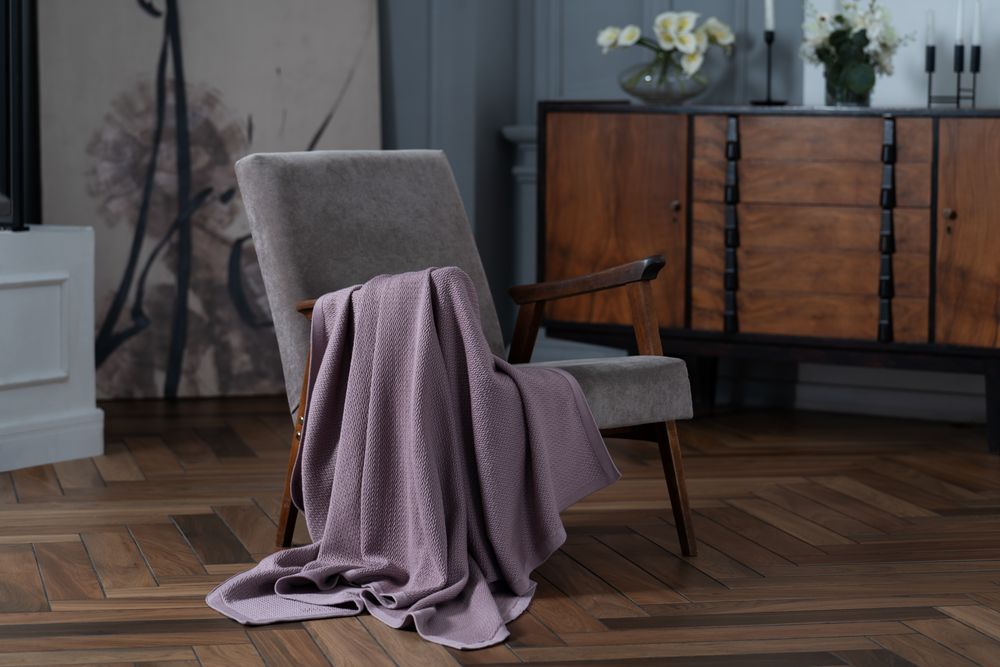 Плед из полушерстяной пряжи, поэтому прекрасно согревает и неприхотлив в уходе.