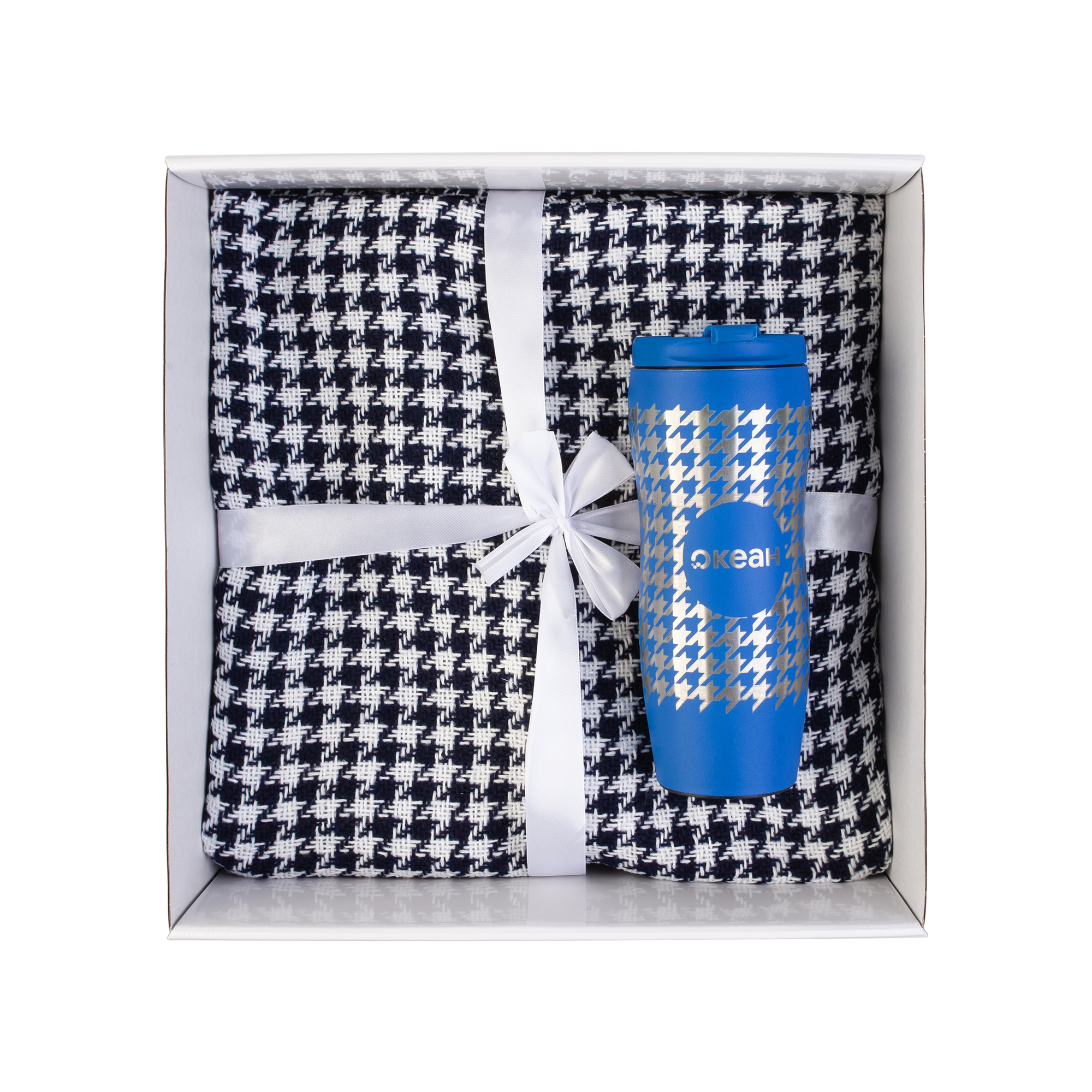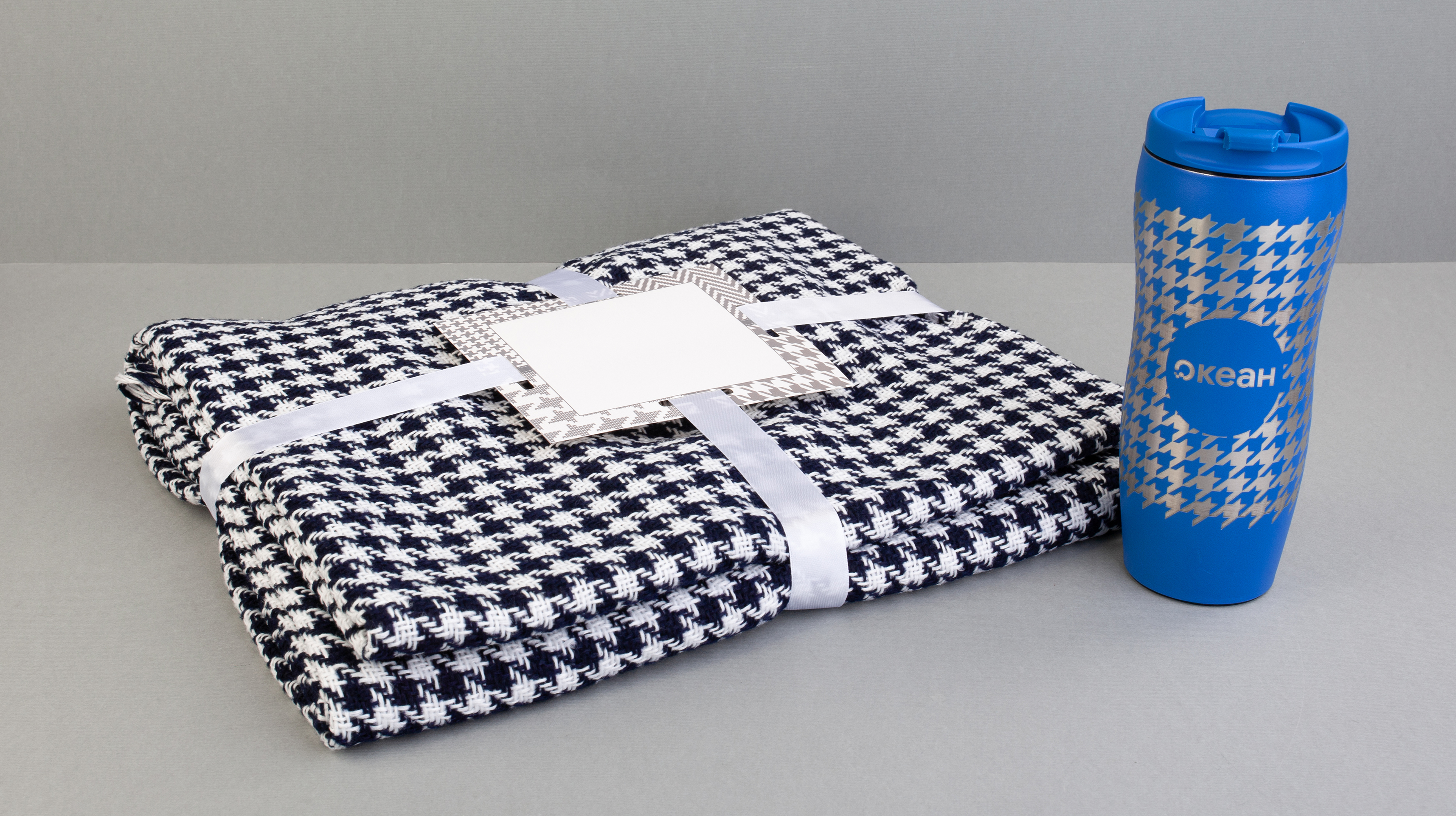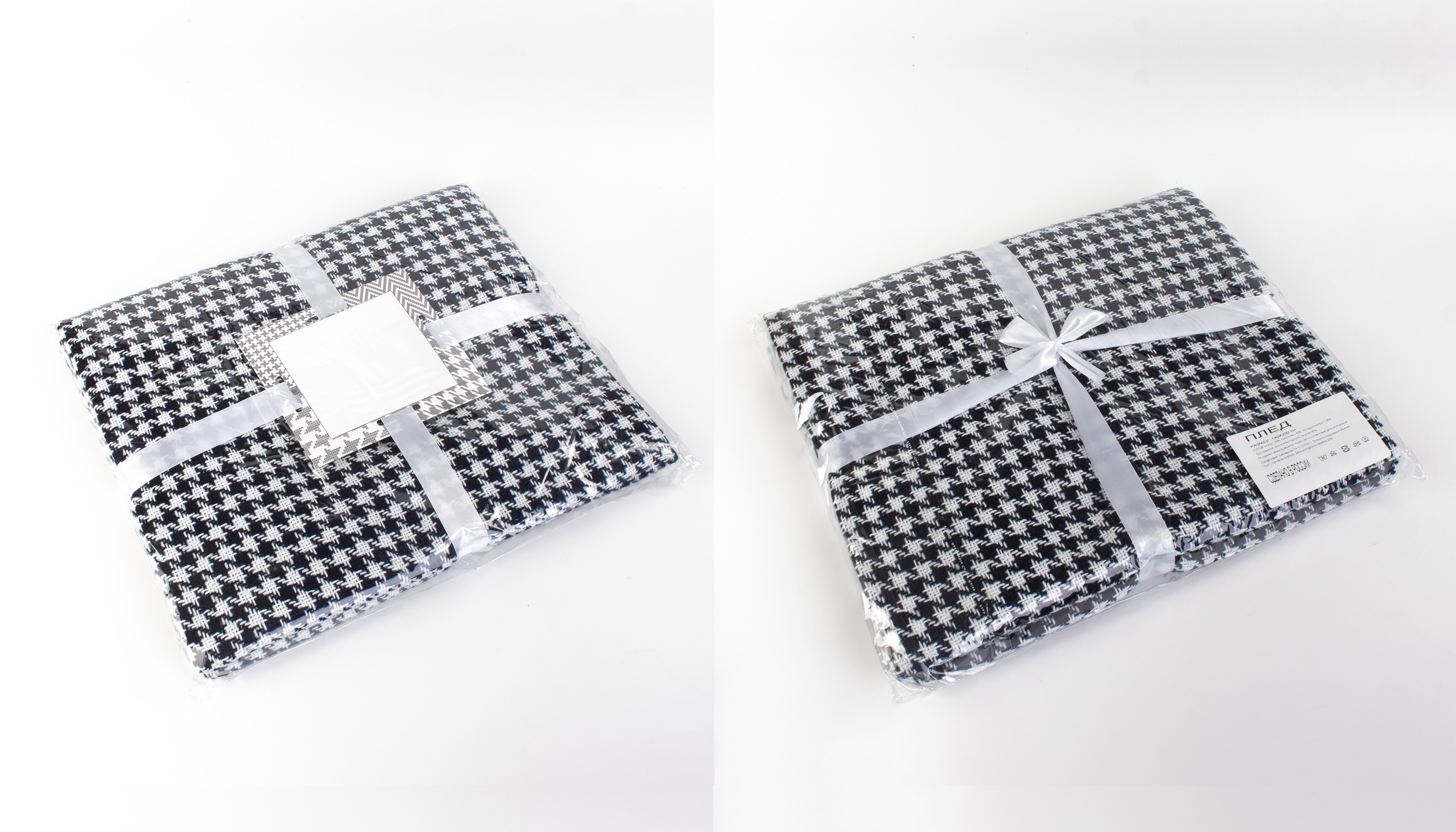 Бахрома по короткой стороне. Плед перевязан атласной лентой с картонной биркой в центре. Размер в собранном виде 32 х 38 см.