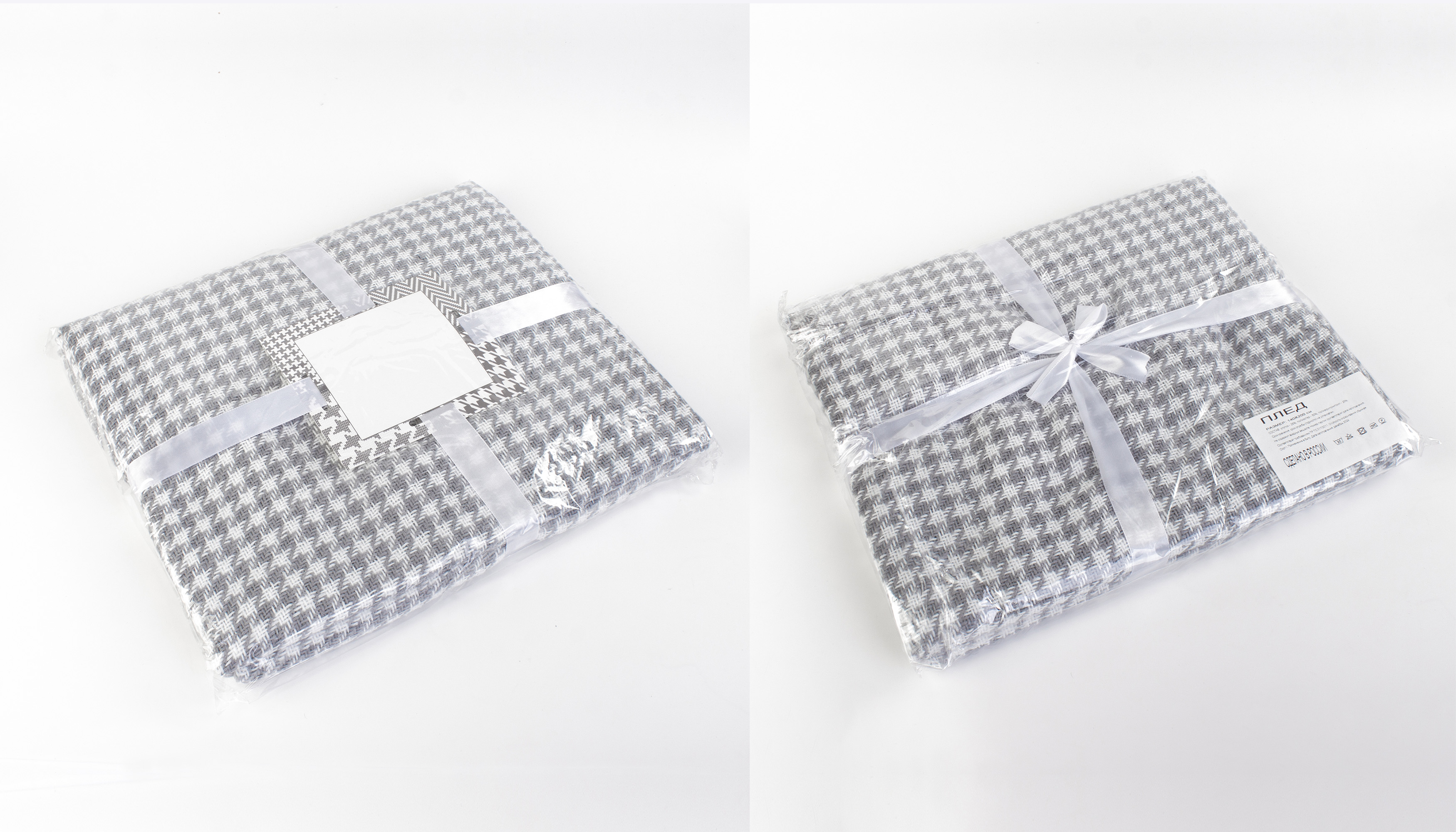 Бахрома по короткой стороне. Плед перевязан атласной лентой с картонной биркой в центре. Размер в собранном виде 32 х 38 см.