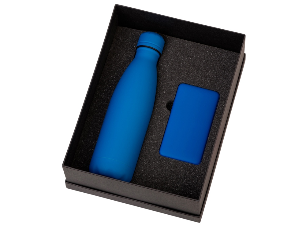 повербанк- пластик с покрытием soft-touch, термобутылка- нержавеющая cталь с покрытием soft-touch