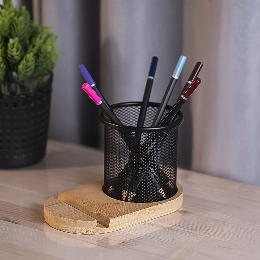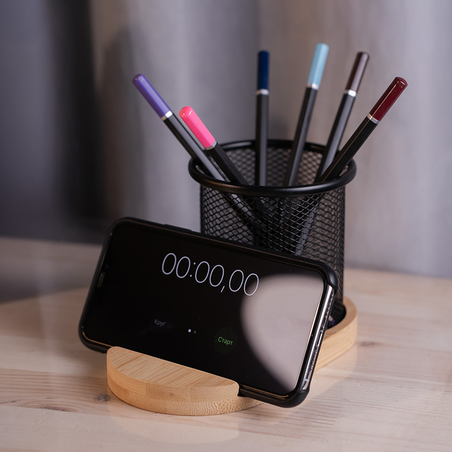 Как правило, на рабочем столе нам всегда не хватает места, т.к. каждый из однофункциональных предметов претендует на полезную площадь. Вашему вниманию предлагается дуэт, в котором объединены 2 функции. Это подставка для телефона из бамбука и металлический стакан-подставка под пишущие принадлежности. Комплект изготовлен из природных материалов. Позволяет организовать свое рабочее пространство стильно и компактно. • Размер подставки: 16,5 х 9,5 х 1,7 см• Размер выемки для гаджета 13 мм• Размер стакана под пишущие принадлежности: 8,5 х 8,5 х 9,5 см -