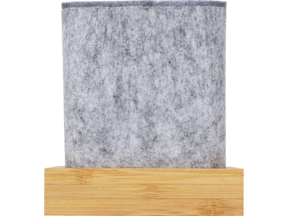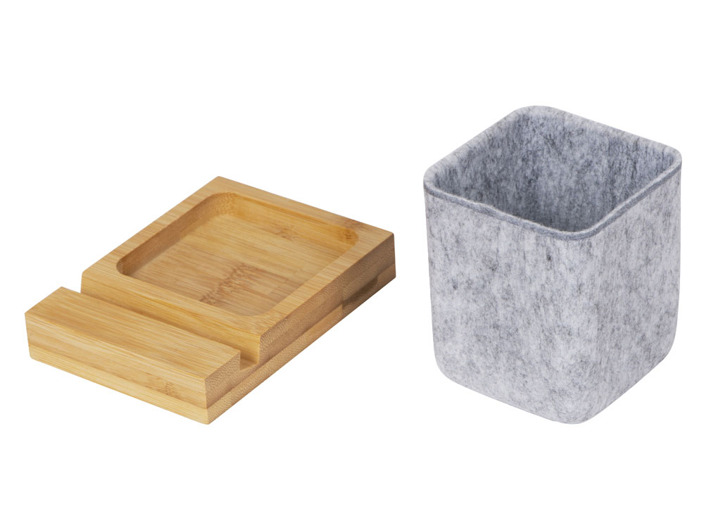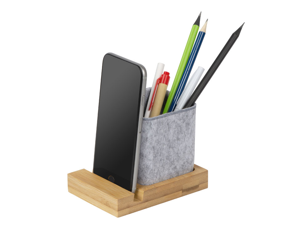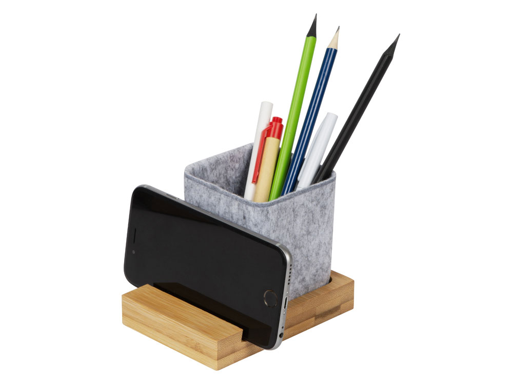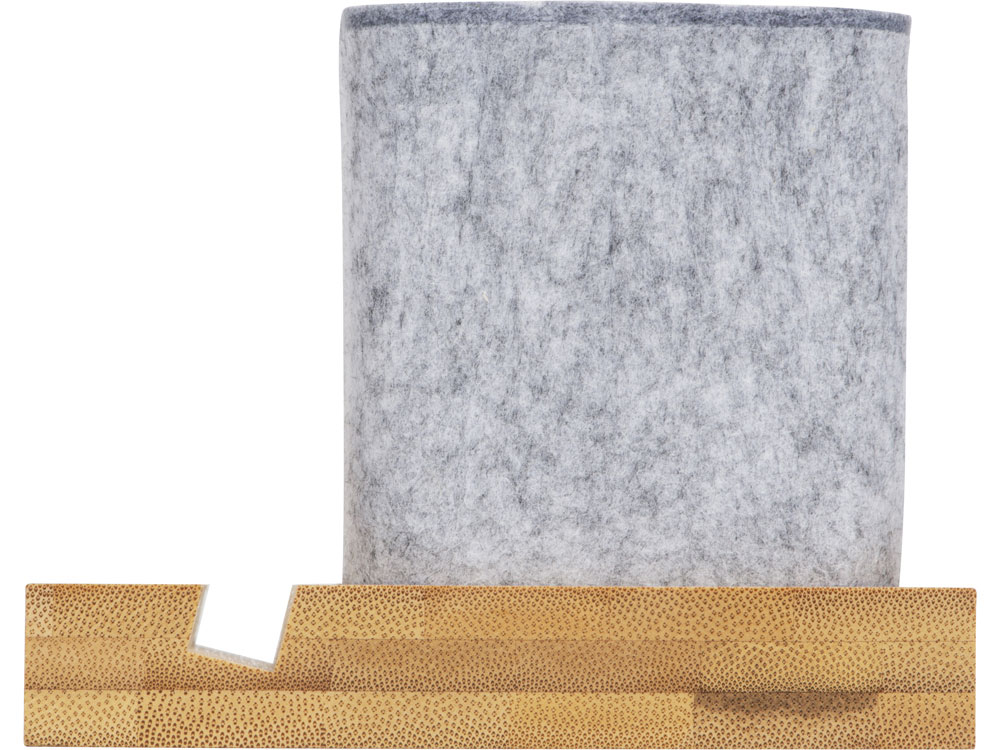 Подставка на рабочий стол для ручек и карандашей из RPET-фетра на подставке из бамбука. У бамбуковой подставки выемка 10 мм, в которую можно поставить телефон. -
