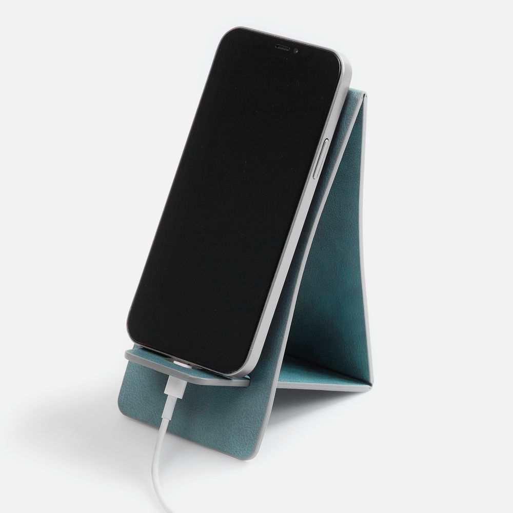 Складная подставка для телефона с вырубкой под шнур зарядного устройства. Выполнена из материала Petrus.