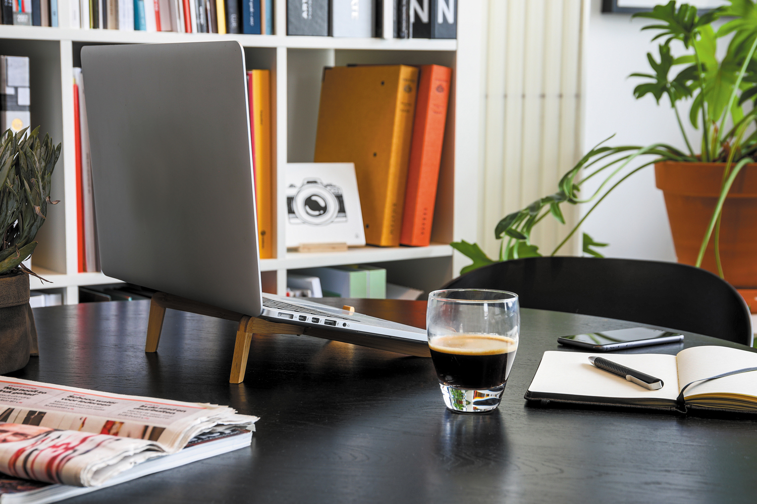 Складная подставка для ноутбука идеально подойдет для работы вне офиса. С ее помощью легко разместить экран гаджета на комфортном для глаз уровне, а ноутбук будет надежно защищен от перегревания. Для хранения и переноски есть компактный чехол из хлопка. Подставка подойдет для устройств диагональю до 15,6 дюймов. Кроме того, ее можно использовать для кулинарных книг во время готовки.