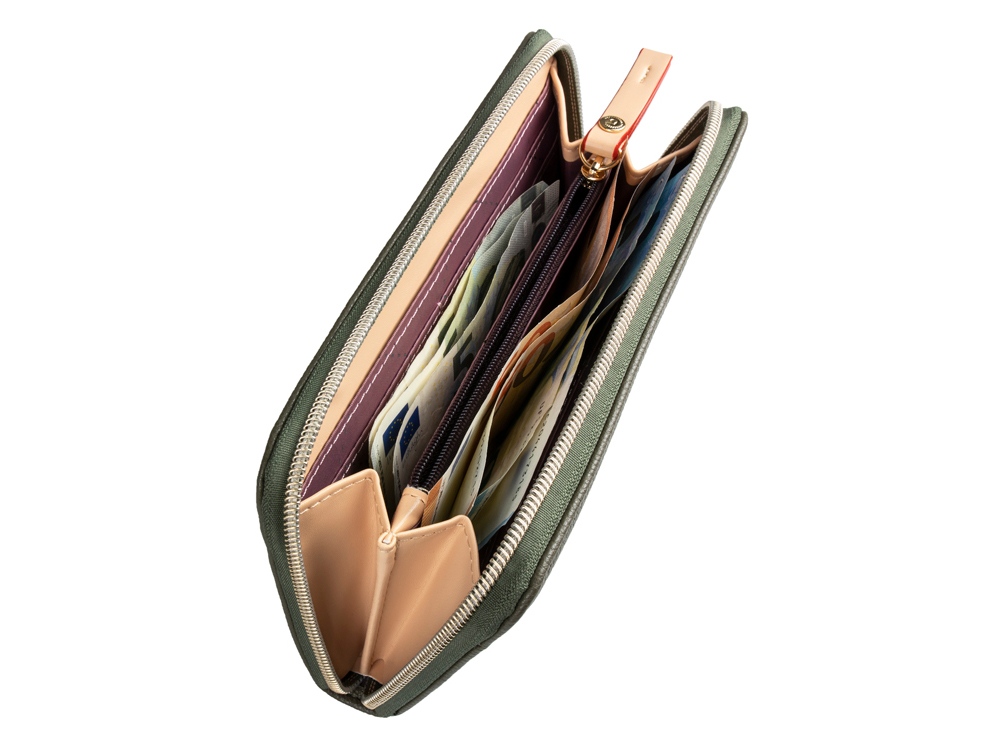 Функциональная организация: отделение для монет на молнии, 2 отделения для банкнот, 9 слотов для карточек, 2 кармана