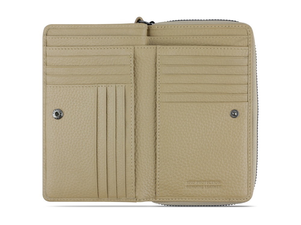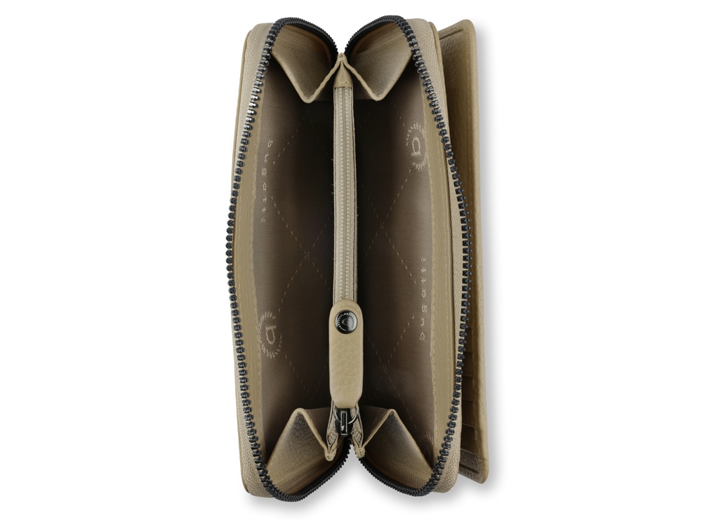 Функциональная организация: основное отделение на молнии, 14 слотов для карт, 4 кармана, 2 отделения для купюр, отделение для монет, ремешок на запястье, защита данных RFID.