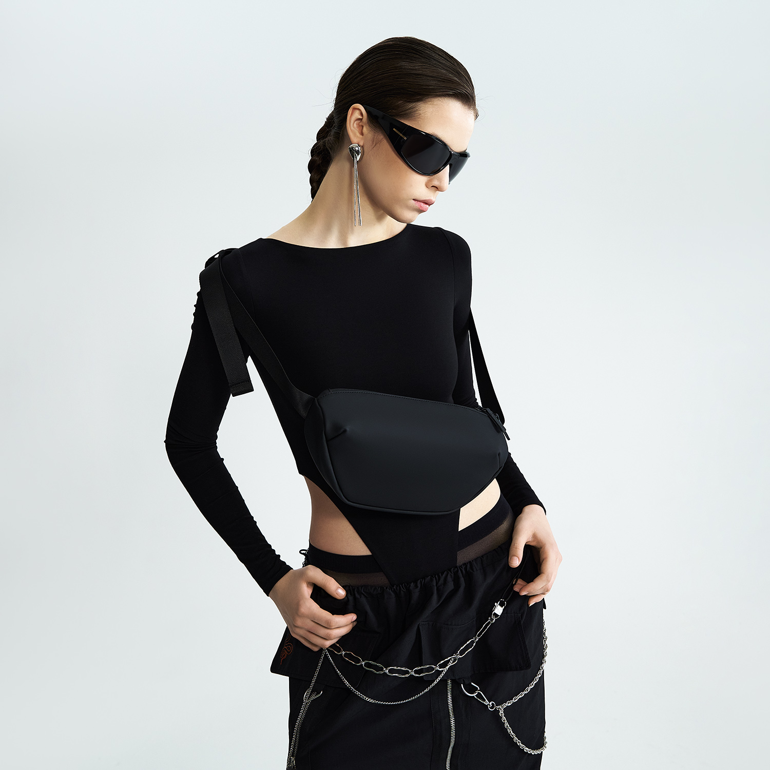 Внутри — карман-органайзер, снаружи, на тыльной стороне, — скрытый карман. Регулируемый ремень позволяет носить сумку на плече, через грудь или на поясе.