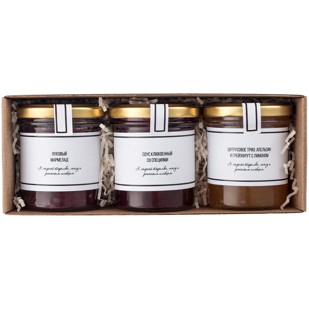 В набор входят три вида соусов:- соус клюквенный со специями (состав: клюква, чеснок, базилик сушеный, перец черный молотый, корица молотая, прованские травы, гвоздика целая, сахар, лимонная кислота, вода);