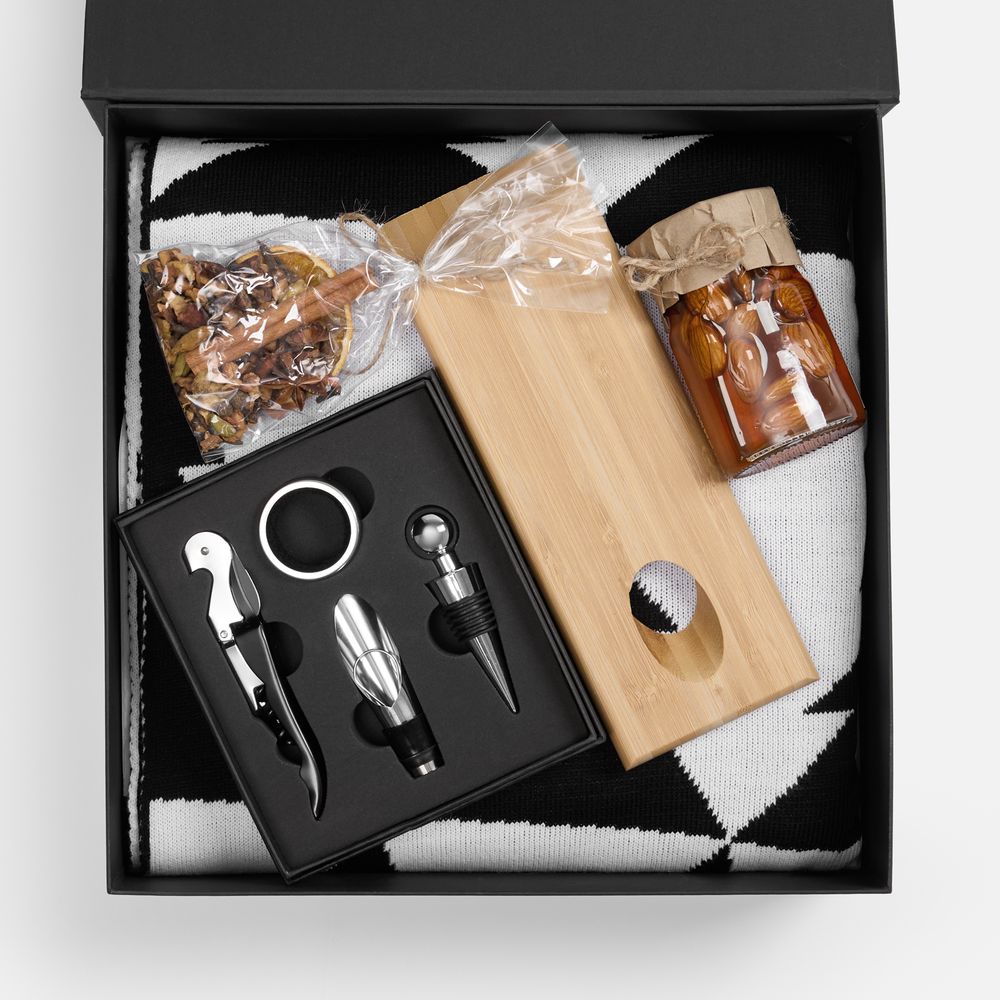 Набор Spicy Weekend создан специально для томных и непременно согревающих уикендов: в такой компании получится устроить настоящий праздник удовольствия и вкуса. Функциональные винные аксессуары подарят комфорт и добавят эстетики, а мед и традиционные специи придадут домашнему глинтвейну особенный вкус и аромат. Цветовой акцент набора — стильный монохромный плед, станет обязательным атрибутом уютного зимнего вечера.
