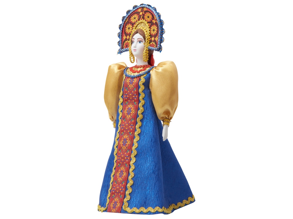 - Фарфоровая кукла в народном костюме ручной работы: расписной сарафан и кокошник с традиционной вышивкой воссоздают образ русской красавицы.