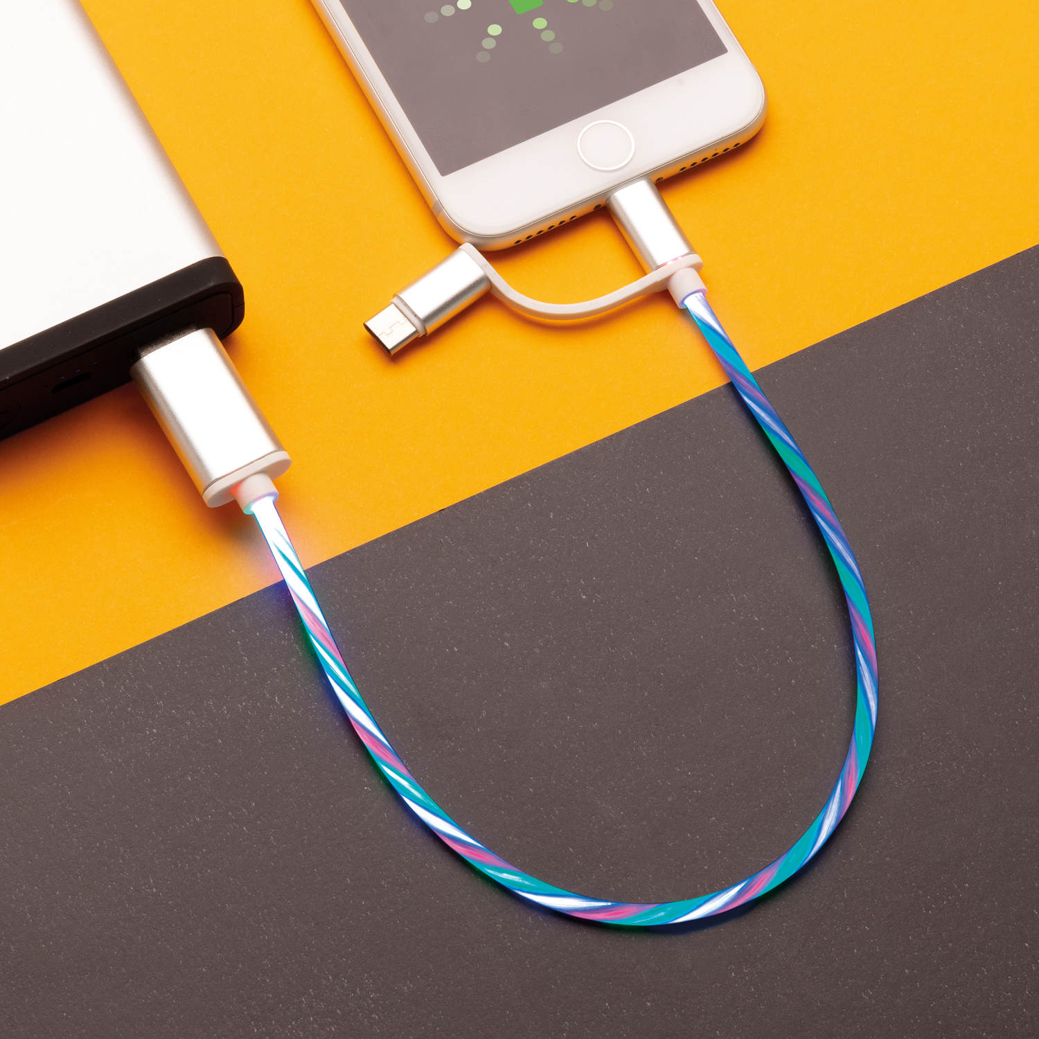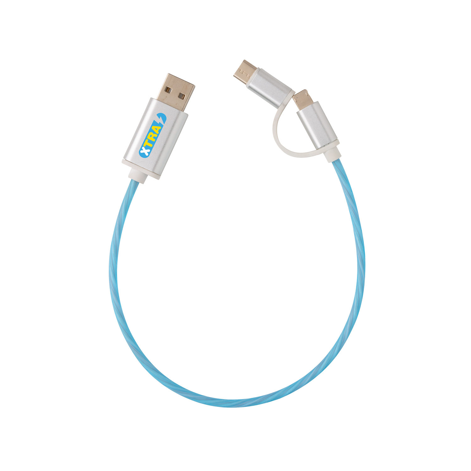 Современный кабель с тремя выходами: Type C и комбинированным разъемом для устройств на платформе iOS и на платформе Android (micro USB). Во время зарядки кабель подсвечивается. Кабель изготовлен из TPE, а разъемы – из прочного алюминия. Подходит для зарядки устройств. Длина: 30 см.