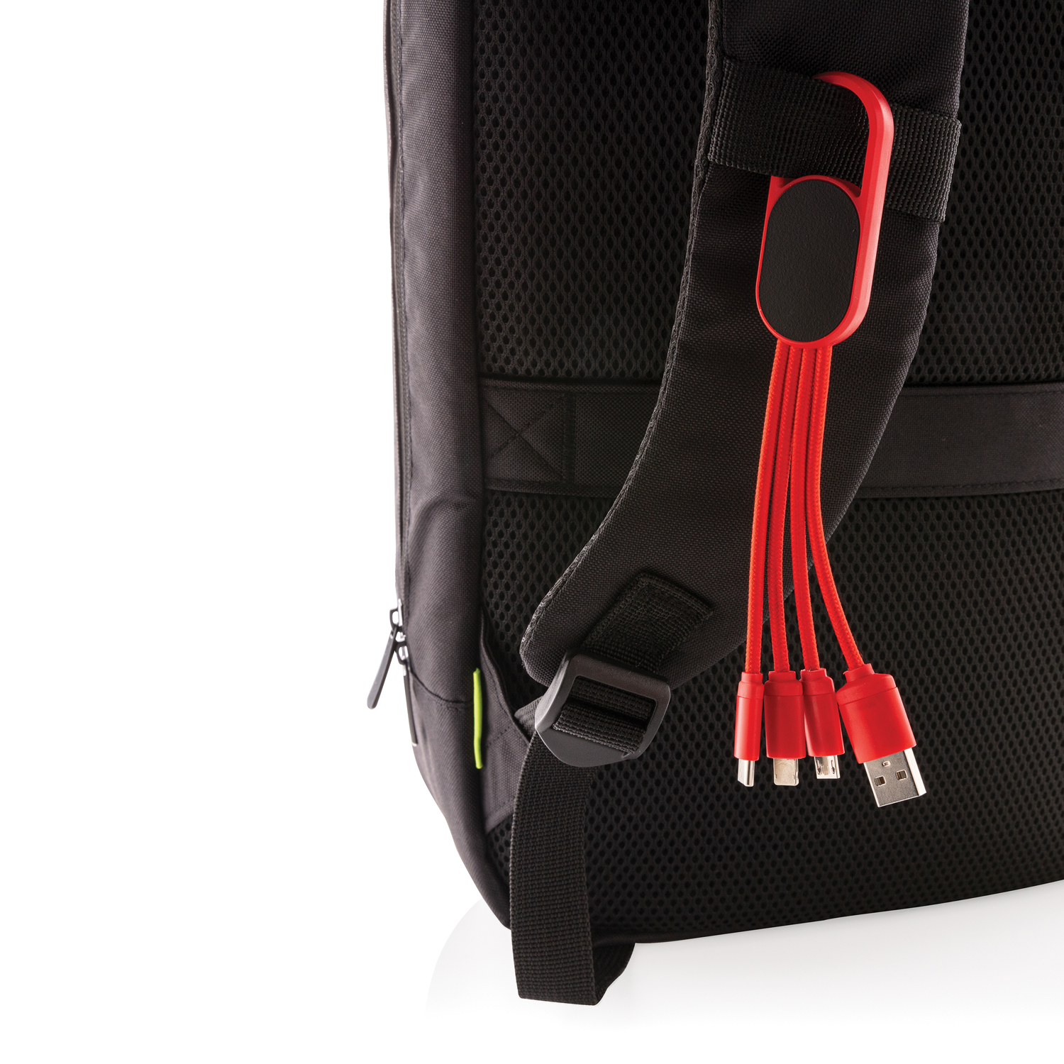 Кабель для зарядки 4 в 1 с карабином. Подходит для любых мобильных устройств, есть разъемы USB, micro USB, Type C и коннектор для гаджетов iOS. Сделан из материала ABS, кабели длиной 10 см в нейлоновой оплетке. Поддерживает зарядку до 2,1 А.