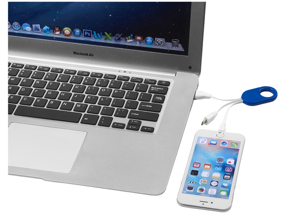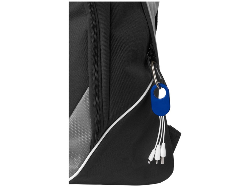 Кабель для зарядки 3-в-1. Кабель для зарядки Troop 3-в-1 с коннектором USB Type C и двойным совместимым коннектором 2-в-1 для устройств Apple® iOS и Android. Кабель оснащен карабином для удобного крепления к сумке. АБС-пластик. -