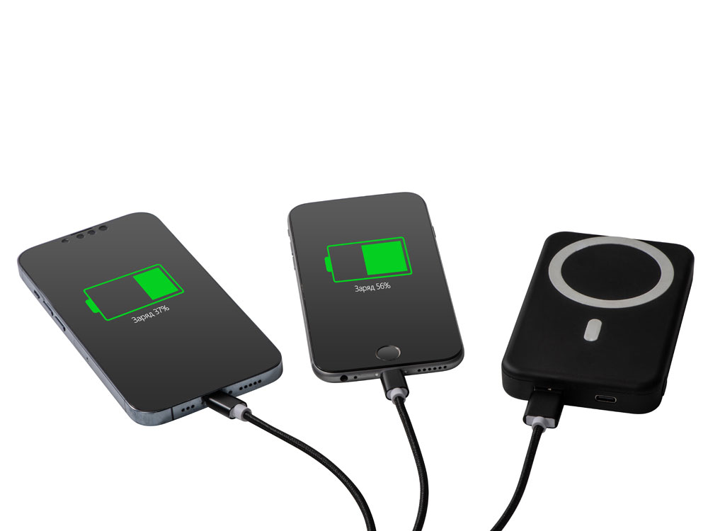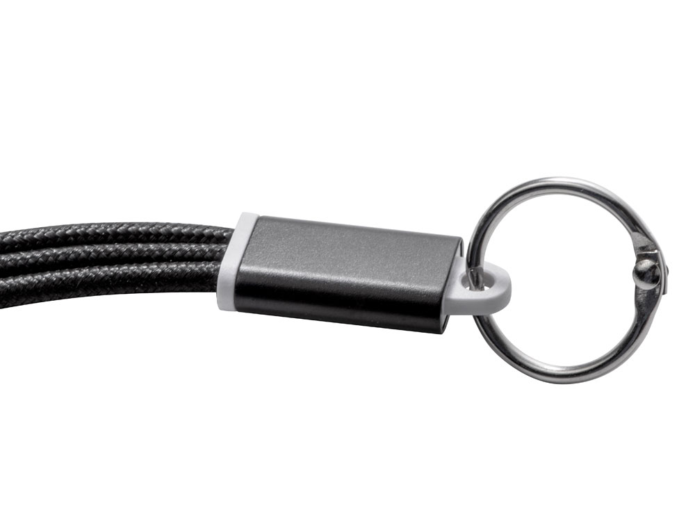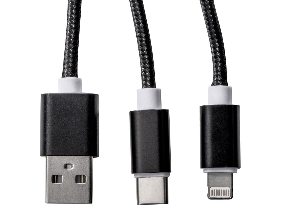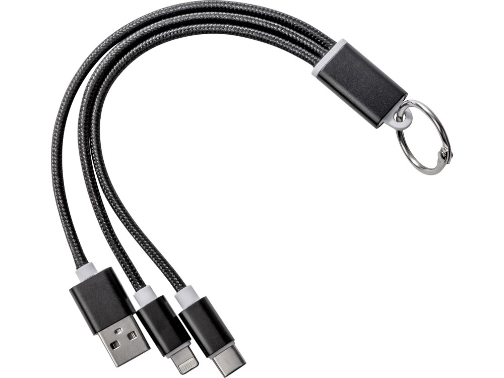 Кабель для зарядки Tres 3-в-1 с брелоком, коннекторами 1 type с, 1 USB type A и двойным совместимым коннектором 2-в-1 для устройств с ОС Apple® iOS и Android. В комплект входит брелок. Для зарядки устройств Apple подключайте кабель стороной без контактов; для зарядки устройств с ОС Android подключайте кабель стороной с контактами. Алюминий. -