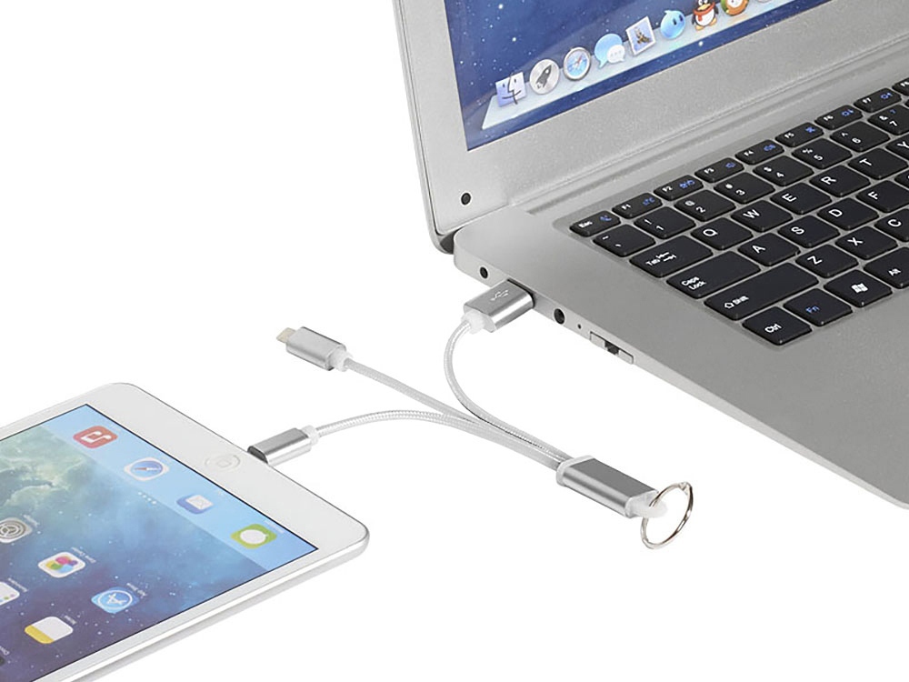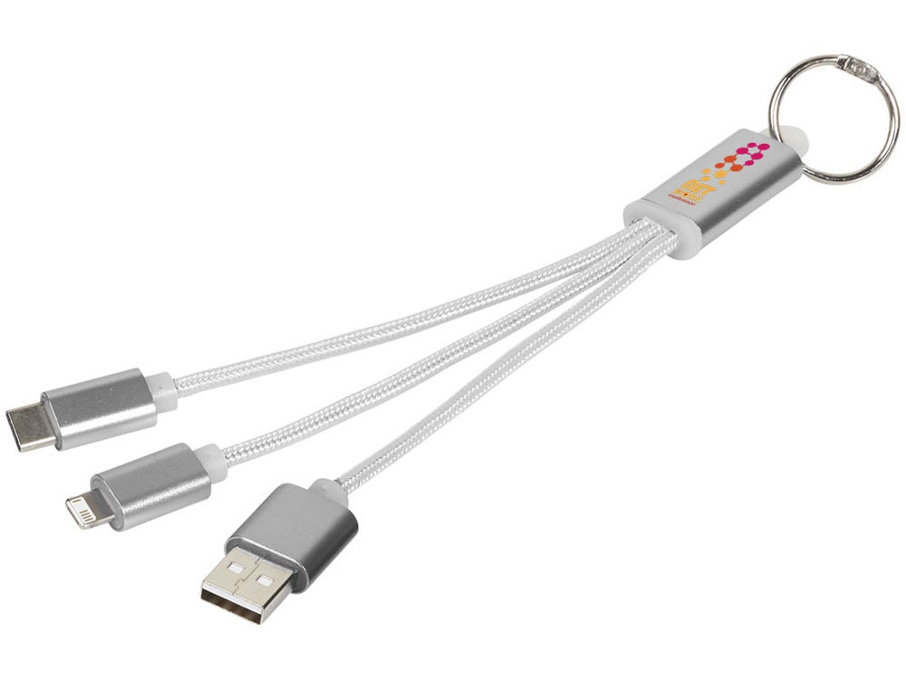 Кабель для зарядки Metal 3-в-1 с брелоком, коннекторами 1 type с, 1 USB type A и двойным совместимым коннектором 2-в-1 для устройств с ОС Apple® iOS и Android. В комплект входит брелок. Для зарядки устройств Apple подключайте кабель стороной без контактов; для зарядки устройств с ОС Android подключайте кабель стороной с контактами. Алюминий. -