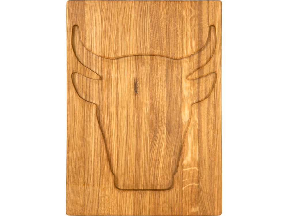 На одной из сторон имеется углубление в форме головы быка, благодаря которому сок из стейка не прольётся на стол.