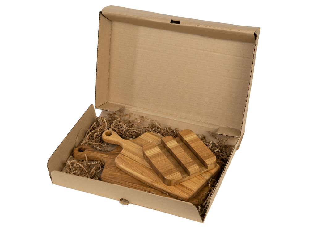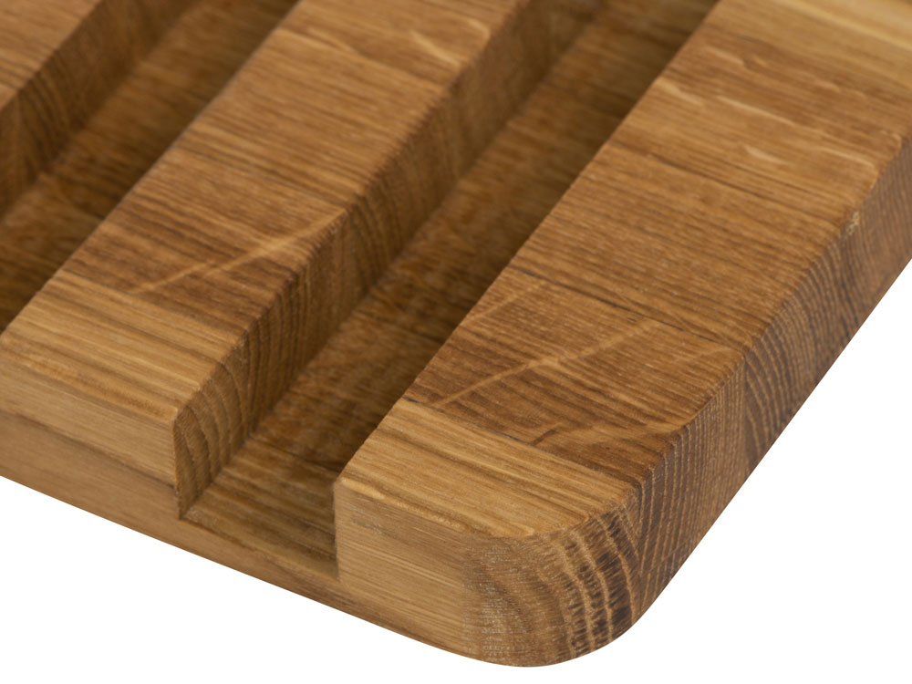 Набор от Eat&Bite состоит из двух разделочных досок из натурального дуба, а также подставки для них. Доски обработаны пищевым маслом, которое не дает древесине растрескаться и помогает поддерживать свежий вид.