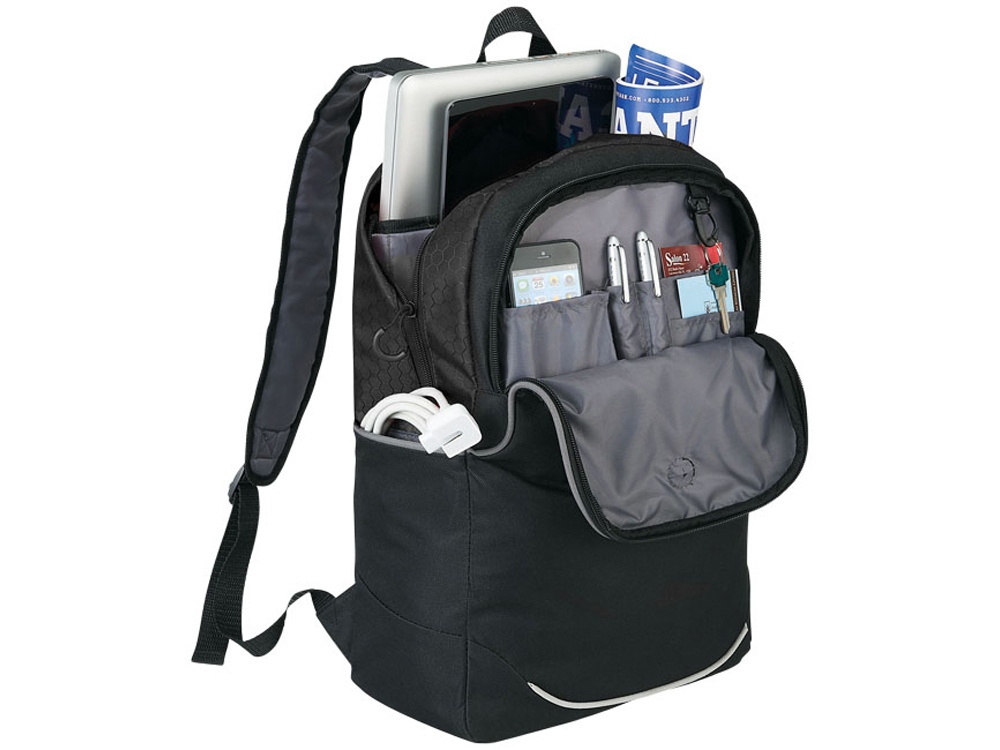 Рюкзак Benton для ноутбука 17. Рюкзак для ноутбука 17Benton с большим основным отделением на молнии и карманом для планшета. Большой передний карман с отверстием для наушников, органайзером для ручек, визиток, технических аксессуаров и других мелочей. Ручка сверху и регулируемые плечевые ремни. 600D полиэстер. -
