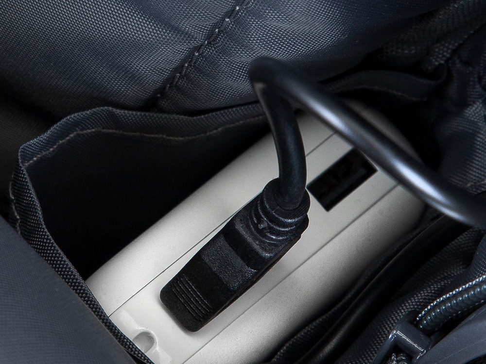 • На боковой стороне рюкзака имеется USB-порт для подключения портативного внешнего аккумулятора к смартфону.