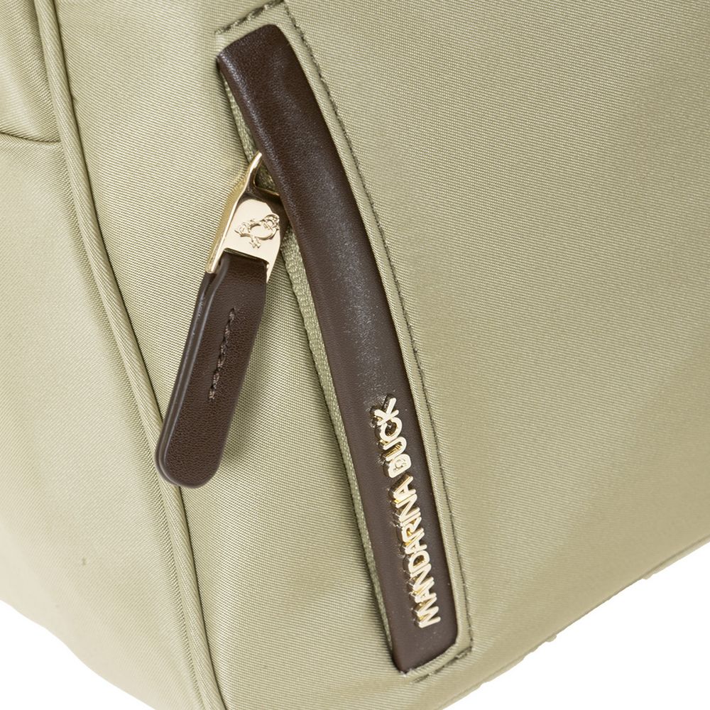 Изготовлен из гладкого влагостойкого нейлона, а также дополнен привлекательной фурнитурой из экокожи и металлизированным логотипом бренда.
