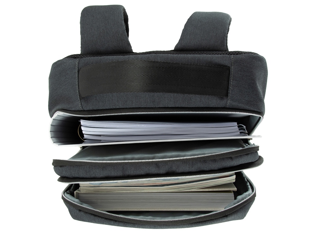 Внутренняя организация: отделение на молнии с USB-портом и мягким отделением для ноутбука 15’’, отделение на молнии с открытым карманом и карманом-органайзером (открытый карман, 3 слота для карточек, 2 держателя для пишущих принадлежностей)