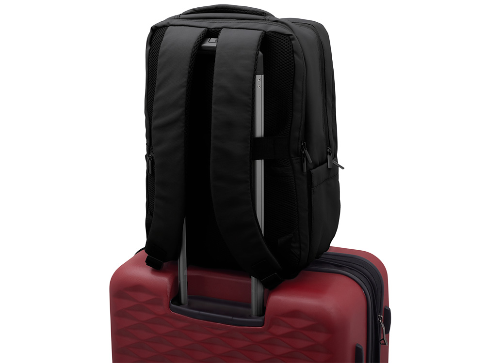 Непромокаемый бизнес рюкзак с двумя вместительными отделениями и карманом на молнии спереди. В одном отделении расположены карман для ноутбука и планшета, в другом органайзер и много пространства для одежды и других вещей на случай деловой поездки. На сетчатой спинке расположен потайной кармана на молнии для документов и личных вещей и ремень для крепления на ручку чемодана. Сверху удобная мягкая ручка для переноски. Лямки регулируются по длине. -