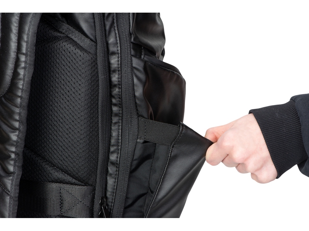 Состоит из 2х отделений - для ноутбука и планшета и основного большого отделения, которое закрывается на магнитный фиксатор вверху. Внутри каждого отделения есть сетчатый карман на молнии для удобства хранения личных вещей. Снаружи расположен передний карман на молнии. Боковой наружный карман с каждой стороны состоит из 2х отделений: большого на молнии и меньшего, расширяющегося с помощью эластичной вставки. Благодаря двойным бегункам молния основного отделения открывается сверху и сбоку. В рюкзаке предусмотрено много полезных мелочей для удобства использования: