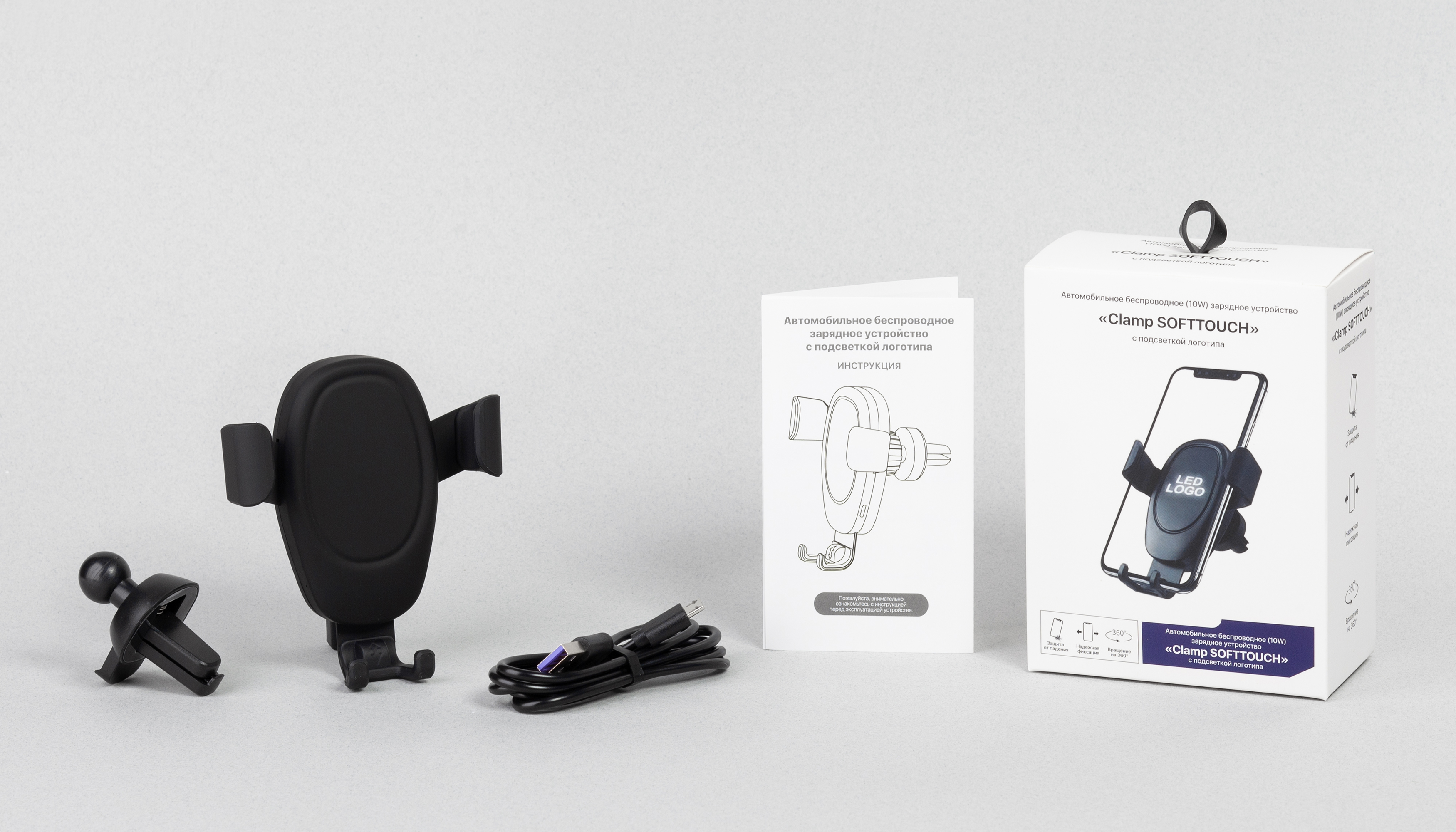 Автомобильное беспроводное (10W) зарядное устройство "Clamp SOFTTOUCH" с подсветкой логотипа, покрытие soft touch