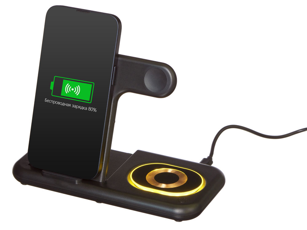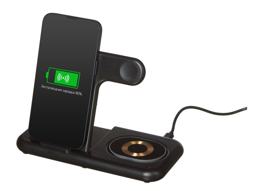 Беспроводная зарядная станция на 3 устройства MajestiQ с прогрессивным дизайном: модуль беспроводной зарядки в вертикальном сегменте станции может менять свое положение по принципу слайдера. Это позволяет настроить положение под размер любого смартфон, не снимая чехла. На станции можно заряжать три беспроводных устройства одновременно: смарт-часы Apple, смартфон и беспроводные наушники. Вместо наушников можно расположить для зарядки второй смартфон. MajestiQ поддерживает быструю беспроводную зарядку 15 Вт. * В зарядные модули встроена атмосферная подсветка с тремя уровнями яркости. Поставляется в сложенном виде, угол наклона можно выставить практически любой.