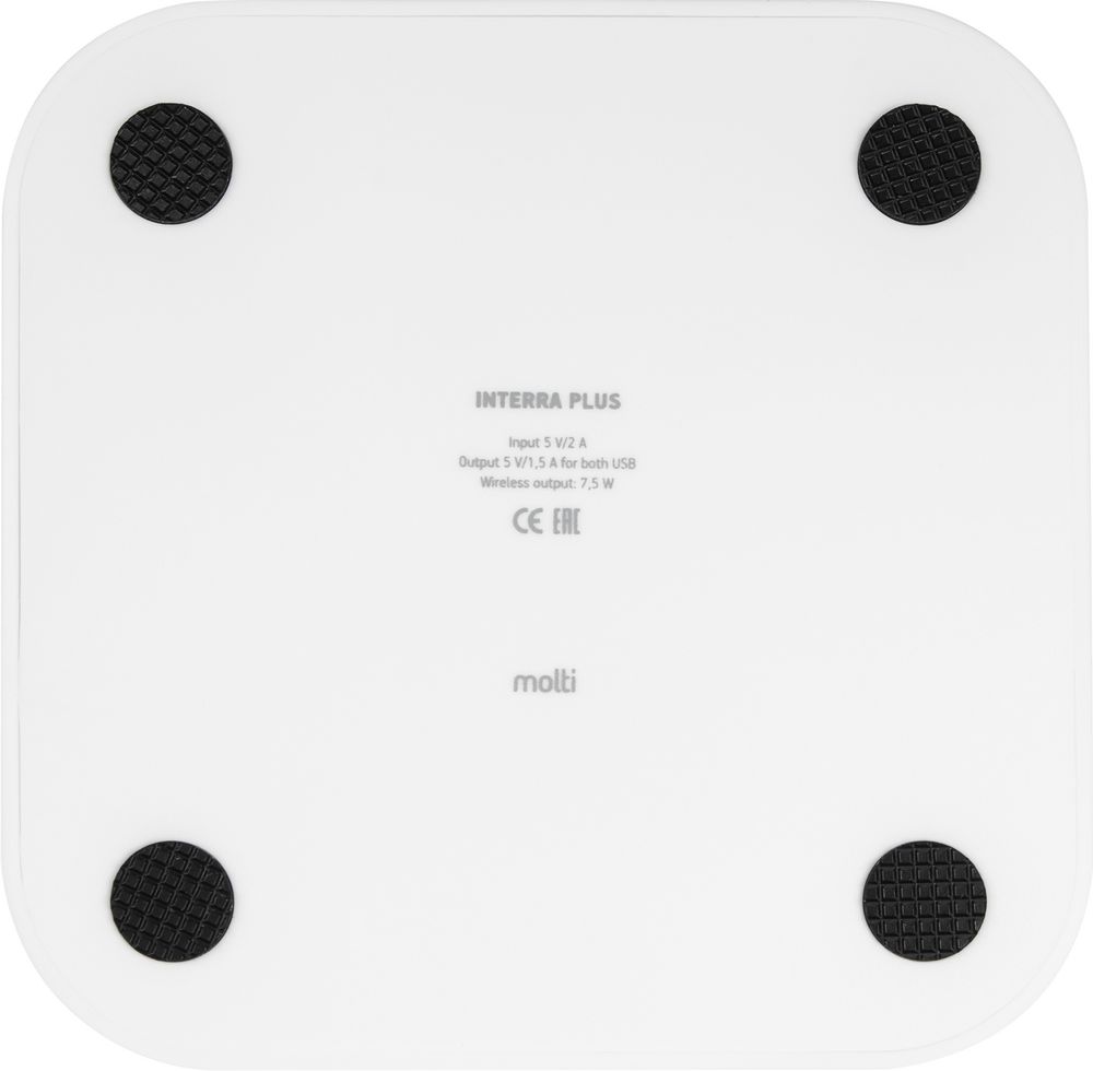 При подключении к внешнему сетевому адаптеру светодиодный индикатор мигнет два раза: устройство Interra Plus готово к размещению на верхней части корпуса смартфона с поддержкой беспроводной зарядки.- Модуль беспроводной зарядки и 2 порта USB