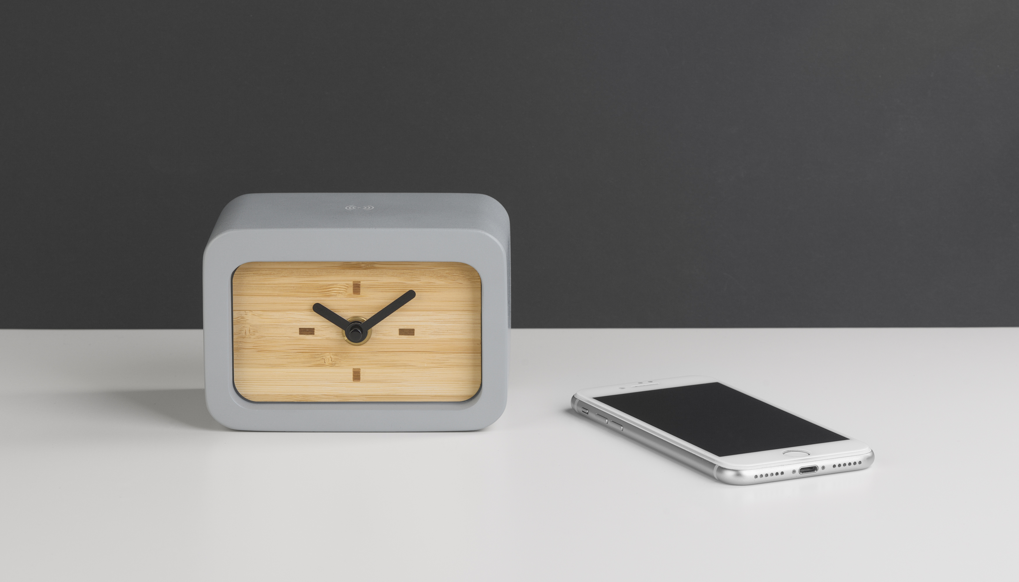Часы «Stonehenge» в благородном исполнении природных материалов сочетают в себе функцию беспроводного зарядного устройства.