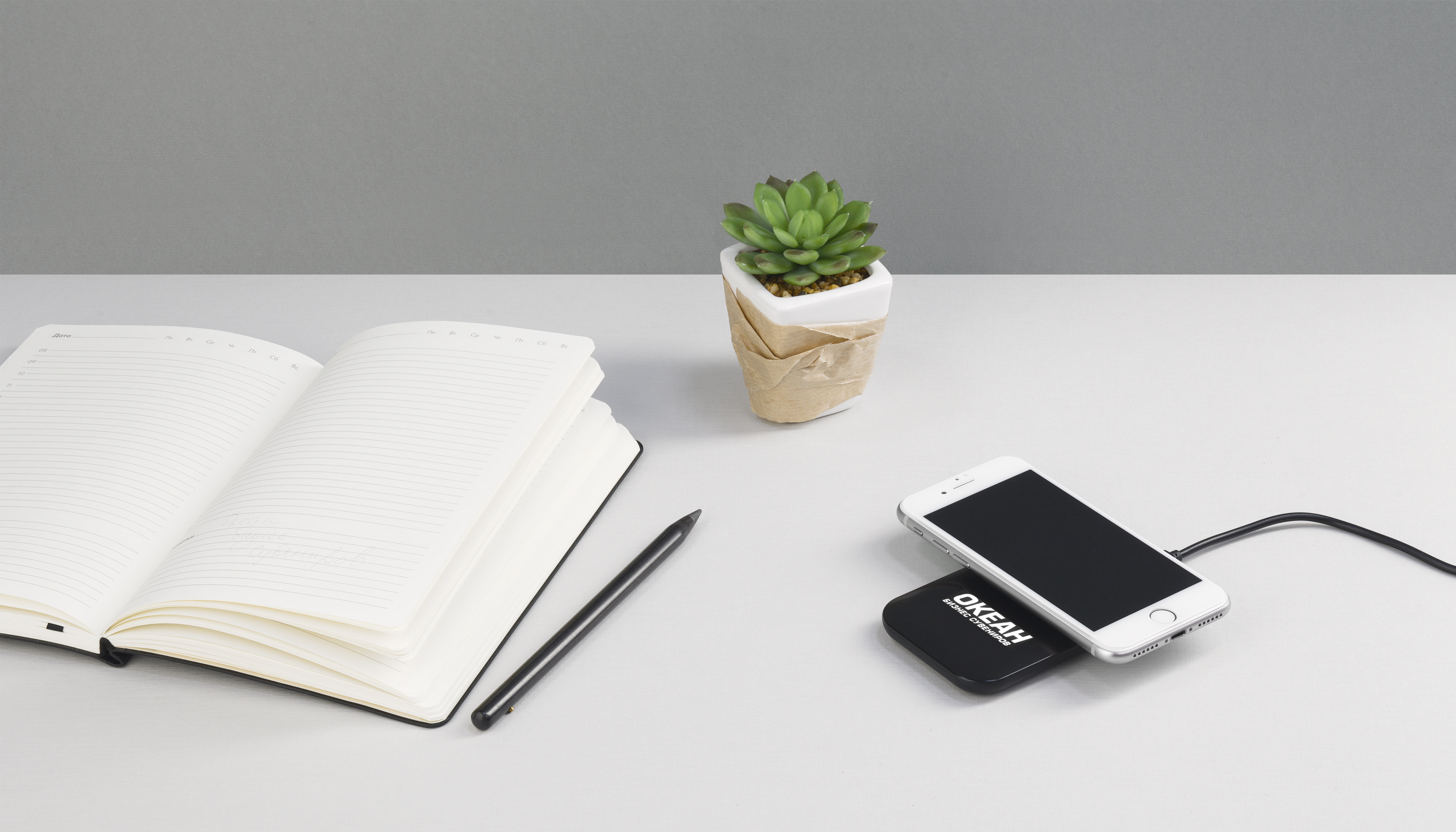 Компактное настольное устройство для беспроводной зарядки гаджетов/смартфонов.