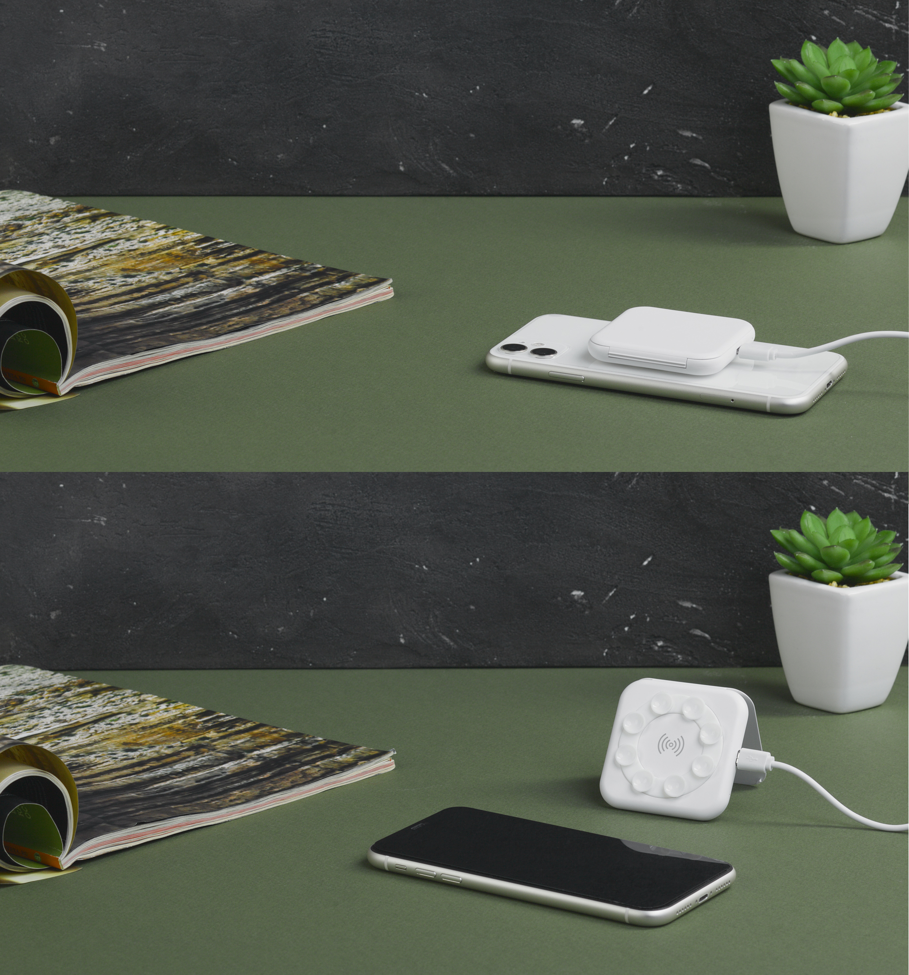 Компактное беспроводное зарядное устройство «Sattelite» сочетает в себе функцию беспроводной зарядки и подставку. Кроме того, оно имеет удобное крепление на присосках, благодаря чему его легко закрепить на смартфоне!