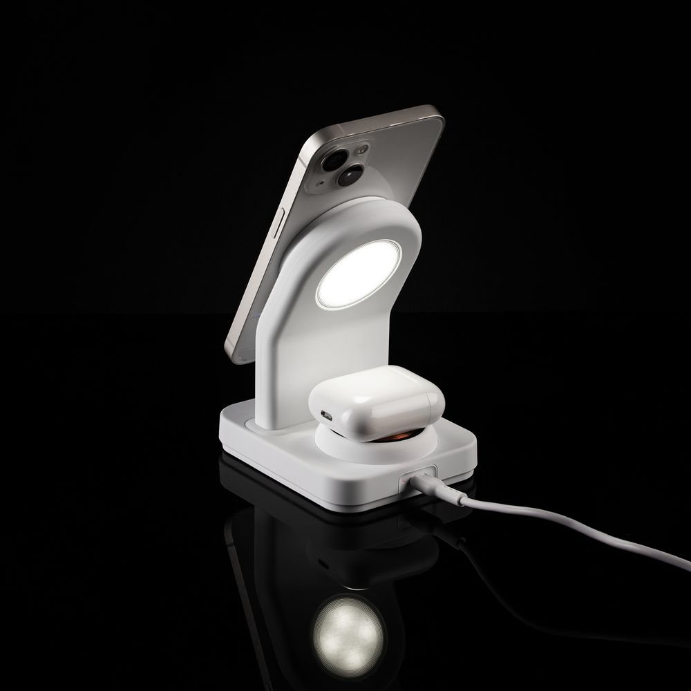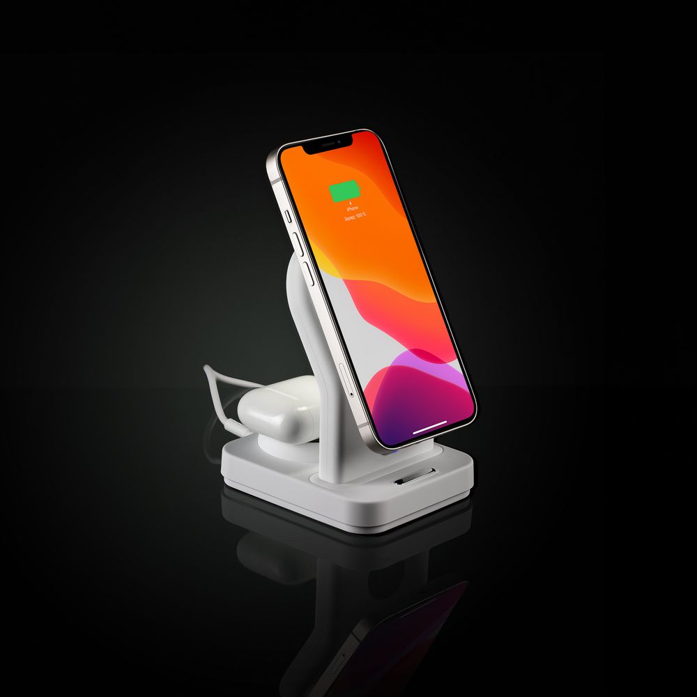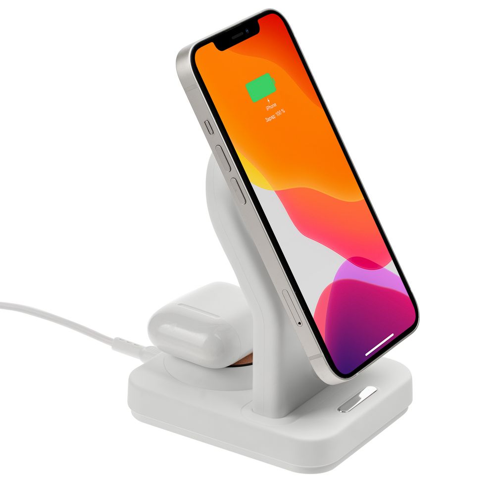 iPhone 12–15 c магнитами MagSafe могут удерживаться на основной области станции. Ранние или компактные модели iPhone или смартфоны с диагональю 5,7–6" на OS Android можно оснастить специальным адаптером Magmate или чехлом со встроенным кольцевым магнитом сзади.- Выходная мощность беспроводного заряда при использовании рекомендованного зарядного устройства QC 3.0 с выходом 5 В, 2 А; 9 B, 2 A; 12 В, 1,67 А