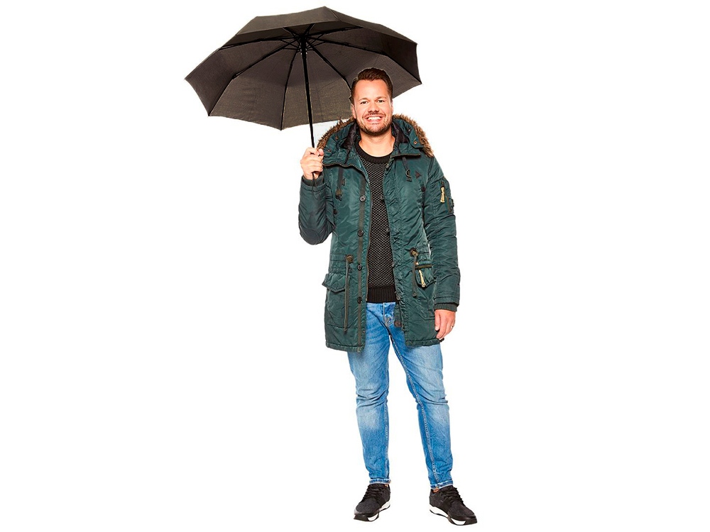 Добротный автоматический зонт с куполом из эпонжа и гибкими спицами из стекловолокна спасет от дождя и выстоит против порывов ветра. Чехол в комплекте -