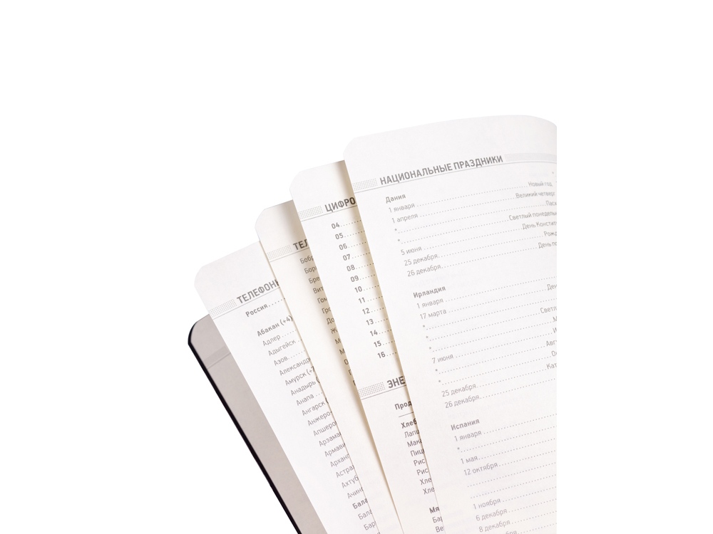 В ежедневнике Megapolis Flex есть полезная справочная информация и телефонная книга, а также страницы для записи идей, мыслей и составления рабочих планов. Для изготовления страниц используется качественный бежевый офсет повышенной плотности (70 г/кв м). Блок не привязан к конкретным датам – они указываются в выделенном поле вверху страницы. Тонированная бумага не дает глазам утомиться даже при длительной работе.