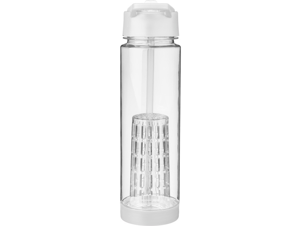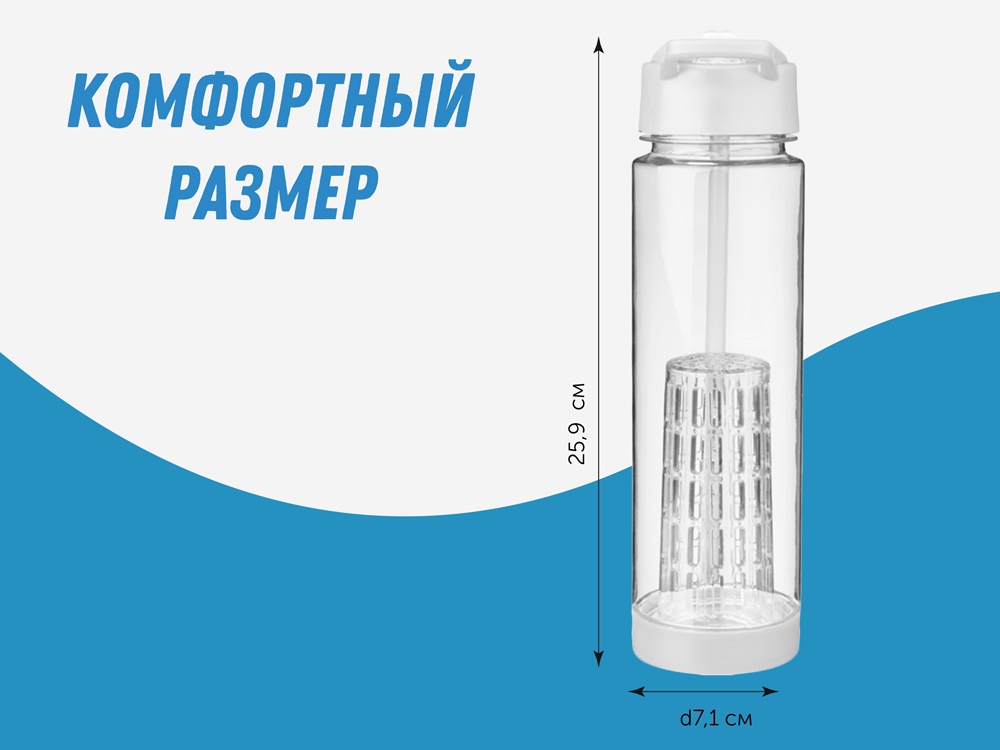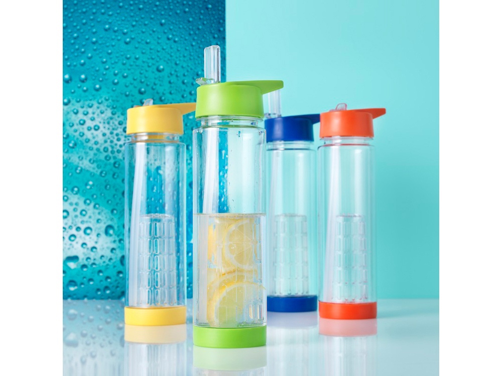 Оригинальная бутылка для воды. Благодаря отделению для фруктов есть возможность создания лимонада на свой вкус. Придется по вкусу любителям натуральных продуктов и здорового образа жизни. Легко разбирается. На пластиковый корпус возможно нанесение тампопечати. Объем – 740 мл. -
